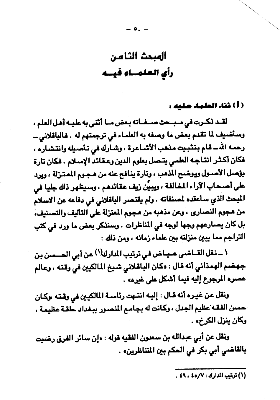 لقد ذكرت في مبحث صفاته بعض ما أثني به عليه أهل العلم، وسأضيف لما تقدم بعض ما وصفه به العلماء في ترجمتهم له. فالباقلاني - رحمه الله - قام بتثبيت مذهب الأشاعرة، وشارك في تأصيله وانتشاره، فكان أكثر انتاجه العلمي يتصل بعلوم الدين وعقائد الإسلام. فكان تارة يؤصل الأصول ويوضح المذهب، وتارة ينافح عنه من هجوم المعتزلة، ويرد على أصحاب الآراء المخالفة، ويبين زيف عقائدهم، وسيظهر ذلك جليًا في المبحث الذي سأعقده لمصنفاته. ولم يقتصر الباقلاني في دفاعه عن الإسلام من هجوم النصارى، وعن مذهبه من هجوم المعتزلة على التأليف والتصنيف، بل كان يصارعهم وجهًا لوجه في المناظرات. وسنذكر بعض ما ورد في كتب التراجم مما يبين منزلته بين علماء زمانه، ومن ذلك: