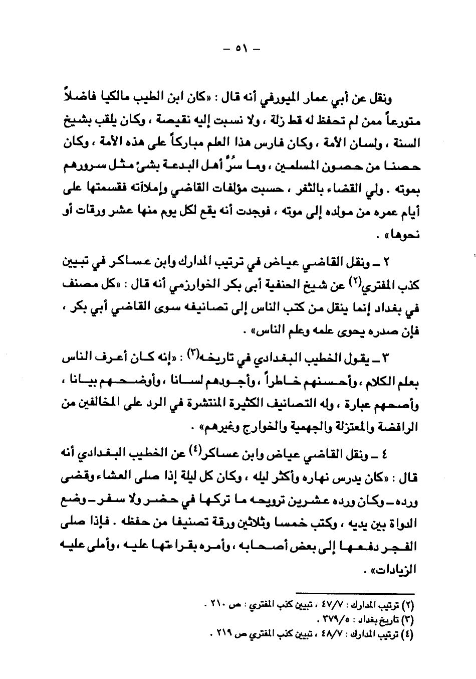 ٢ - ونقل القاضي عياض في ترتيب المدارك وابن عساكر في تبيين كذب المفتري عن شيخ الحنفية أبي بكر الخوارزمي أنه قال: "كل مصنف في بغداد إنما ينقل من كتب الناس إلى تصانيفه سوى القاضي أبي بكر، فإن صدره يحوى علمه وعلم الناس".