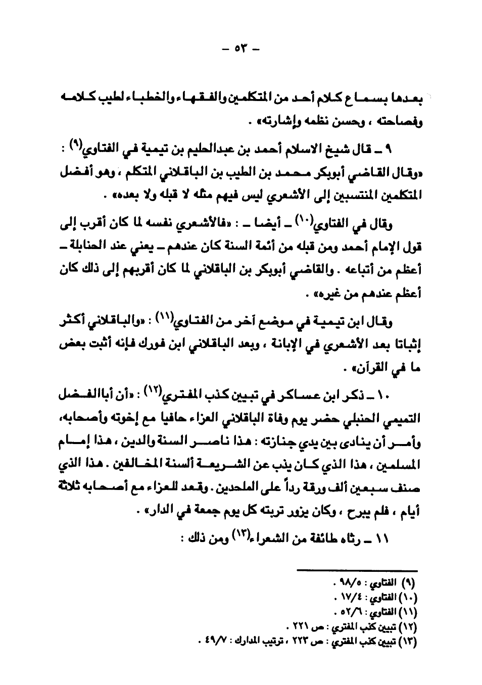 ٩ - قال شيخ الإسلام أحمد بن عبد الحليم بن تيمية في الفتاوي: "وقال القاضي أبو بكر محمد بن الطيب بن الباقلاني المتكلم، وهو أفضل المتكلمين المنتسين إلى الأشعري ليس فيهم مثله لا قبله ولا بعده".
