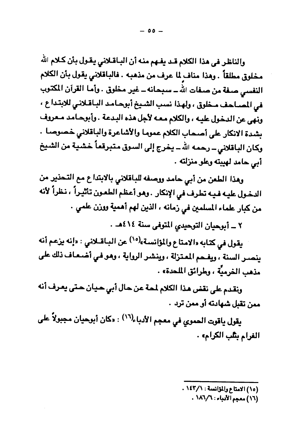 والناظر في هذا الكلام قد يفهم منه أن الباقلاني يقول بأن كلام الله مخلوق مطلقًا. وهذا منافٍ لما عرف من مذهبه. فالباقلاني يقول بأن الكلام النفسي صفة من صفات الله - سبحانه - غير مخلوق. وأما القرآن المكتوب في المصاحف مخلوق، ولهذا نسب الشيخ أبو حامد الباقلاني للابتداع، ونهى عن الدخول عليه، والكلام معه لأجل هذه البدعة. وأبو حامد معروف بشدة الإنكار على أصحاب الكلام عمومًا والأشاعرة والباقلاني خصوصًا. وكان الباقلاني - رحمه الله - يخرج إلى السوق متبرقعًا خشية من الشيخ أبي حامد لهيبته وعلو منزلته.