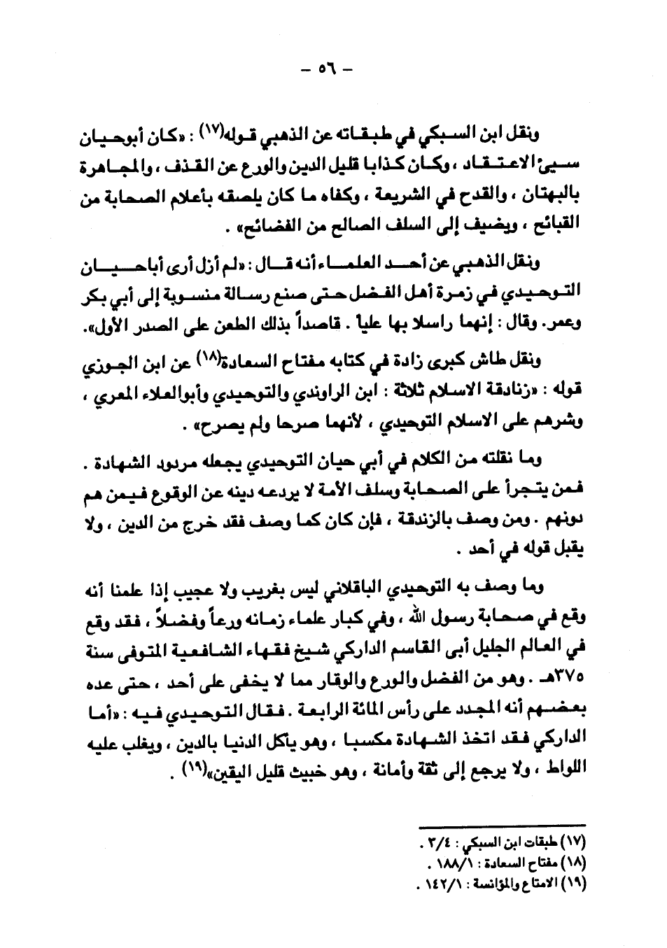 وما نقله من الكلام في أبي حيان التوحيدي يجعله مردود الشهادة. فمن يتجرأ على الصحابة وسلف الأمة لا يردعه دينه عن الوقوع فيمن هم دونهم. ومن وصف بالزندقة، فإن كان كما وصف فقد خرج من الدين، ولا يقبل قوله في أحد.