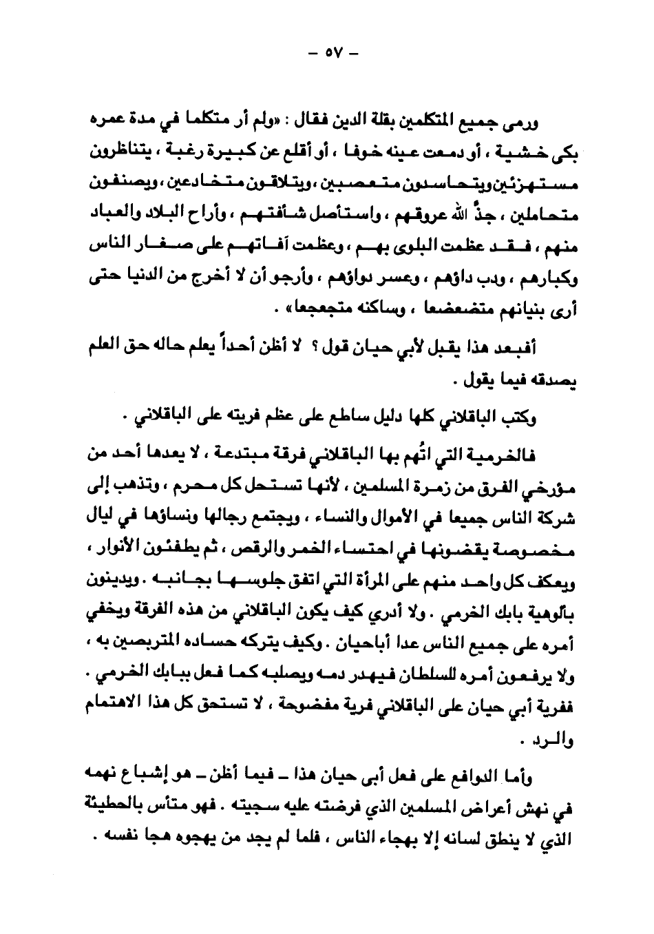 فالخرمية التي اتُهم بها الباقلاني فرقة مبتدعة، لا يعدها أحد من مؤرخي الفرق من زمرة المسلمين، لأنها تستحل كل محرم، وتذهب إلى شركة الناس جميعًا في الأموال والنساء، ويجتمع رجالها ونساؤها في ليال ويعكف كل واحد منهم على المرأة التي اتفق جلوسها بجانبه. ويدينون بألوهية بابك الخرمي. ولا أدري كيف يكون الباقلاني من هذه الفرقة ويخفي أمره على جميع الناس عدا أبا حيان. وكيف يتركه حساده المتربصين به، ولا يرفعون أمره للسلطان فيهدر دمه ويصلبه كما فعل ببابك الخرمي. ففرية أبي حيان على الباقلاني فرية مفضوحة، لا تستحق كل هذا الاهتمام والرد.