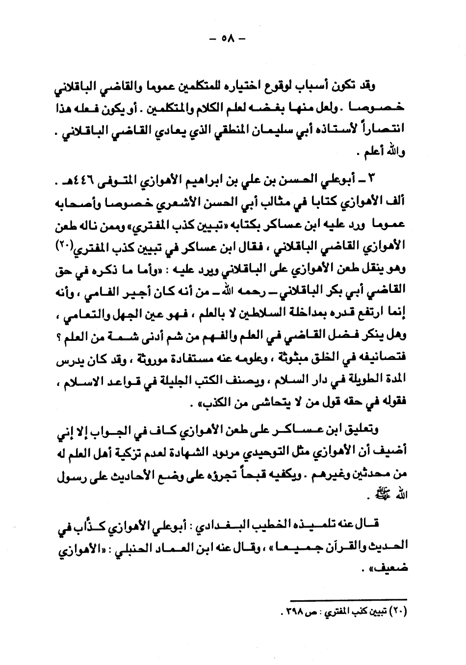 ٣ - أبو علي الحسن بن علي بن إبراهيم الأهوازي المتوفي ٤٤٦ هـ. ألفن الأهوازي كتابًا في مثالب أبي الحسن الأشعري خصوصًا وأصحابه عمومًا ورد عليه ابن عساكر بكتابه "تبين كذب المفتري" وممن ناله طعن الأهوازي القاضي الباقلاني، فقال ابن عساكر في تبيين كذب المفتري وهو ينقل طعن الأهوازي على الباقلاني ويرد عليه: "وأما ما ذكره في حق القاضي أبي بكر الباقلاني - رحمه الله - من أنه كان أجير الفامي، وأنه إنما ارتفع قدره بمداخلة السلاطين لا بالعلم، فهو عين الجهل والتعامي وهل ينكر فضل القاضي في العلم والفهم من شم أدنى شمة من العلم؟ فتصانيفه في الخلق مبثوثة، وعلومه عنه مستفادة موروثة، وقد كان يدرس المدة الطويلة في دار السلام، ويصنف الكتب الجليلة في قواعد الإسلام، فقوله في حقه قول من لا يتحاشى من الكذب".