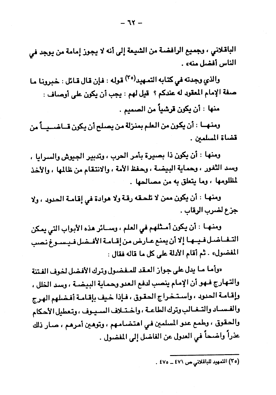 الباقلاني، وجميع الرافضة من الشيعة إلي أنه لا يجوز إمامة من يوجد في الناس أفضل منه".
