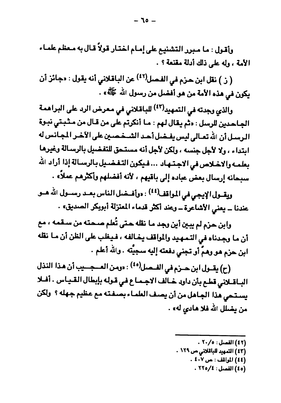 (ز) نقل ابن حزم في الفصل عن الباقلاني أنه يقول: "جائز أن يكون في هذه الأمة من هو أفضل من رسول الله صلى الله عليه وسلم ".