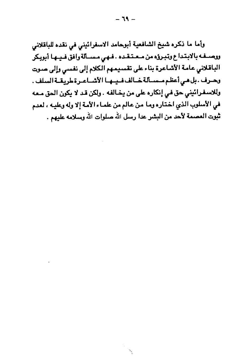 وأما ما ذكره شيخ الشافعية أبو حامد الاسفرائيني في نقده للباقلاني ووصفه بالابتداع وتبرؤه من معتقده. فهي مسألة وافق فيها أبو بكر الباقلاني عامة الشاعرة بناء على تقسيمهم الكلام إلى نفسي وإلى صوت وحرف. بل هي أعظم مسألة خالف فيها الشاعرة طريقة السلف. وللإسفرائيني حق في إنكاره على من يخالفه. ولكن قد لا يكون الحق معه في الأسلوب الذي اختاره وما من عالم من علماء الأمة إلا وله وعليه، لعدم ثبوت العصمة لأحد من البشر عدا رسل الله وسلامه عليهم.