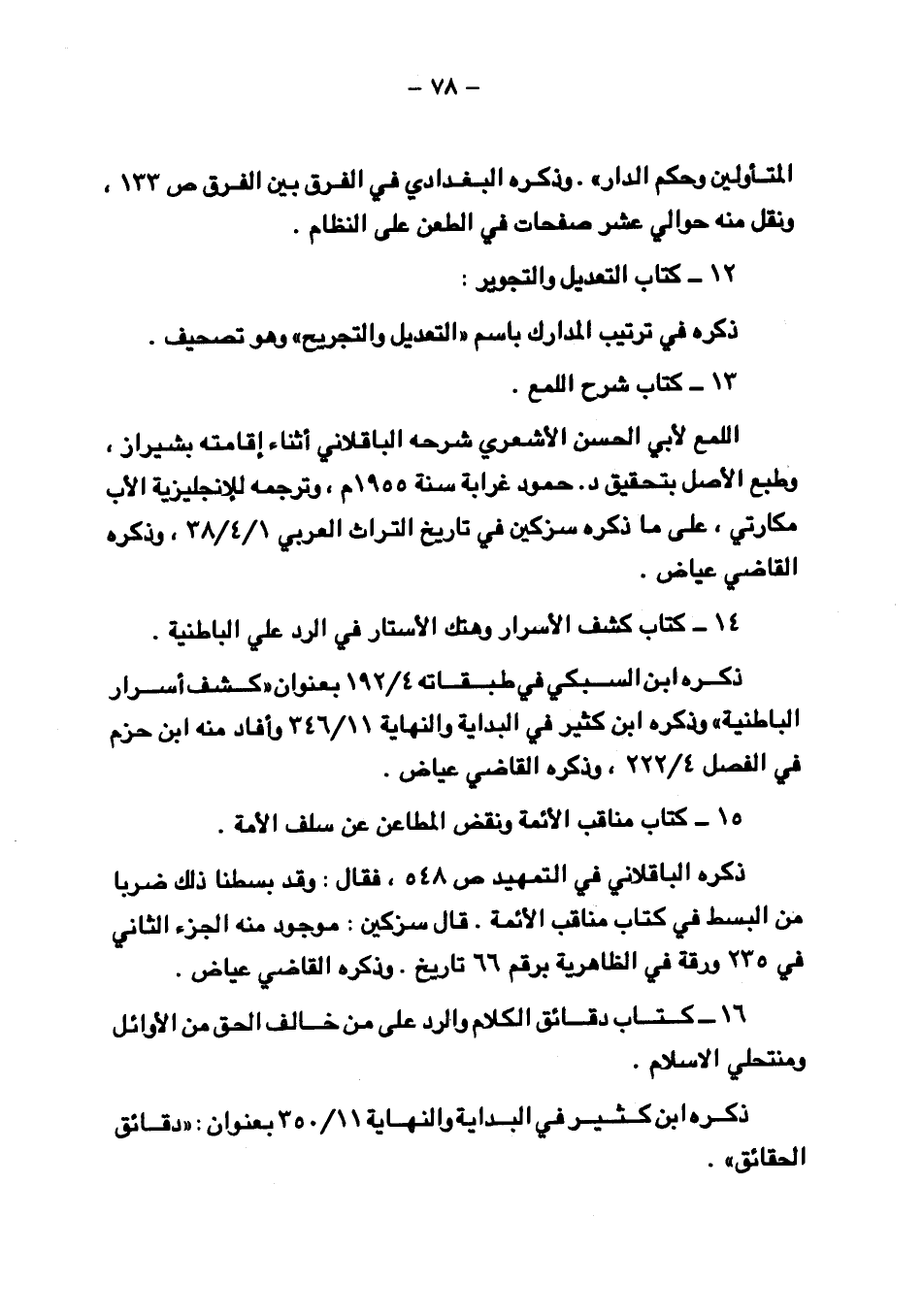 اللمع لأبي الحسن الأشعري شرحه الباقلاني أثناء إقامته بشيراز، وطبع الأصل بتحقيق د. حمود غرابة سنة ١٩٥٥ م، وترجمه للإنجليزية الأب مكارتي، على ذكره سزكين في تاريخ التراث العربي ١/ ٤/٣٨، وذكره القاضي عياض.