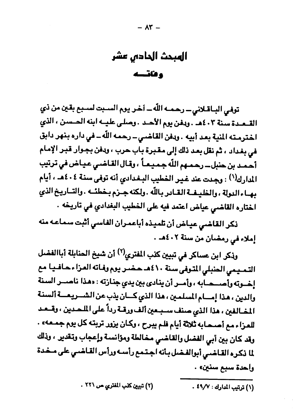 وذكر ابن عساكر في تبيين كذب المفتري أن شيخ الحنابلة أبا الفضل التميمي الحنبلي المتوفي سنة ٤١٠ هـ حضر يوم وفاته العزاء حافيًا مع إخوته وأصحابه، وأمرن أن ينادى بين يدي جنازته: "هذا ناصر السنة والدين، هذا إمام المسلمين، هذا الذي كان يذب عن الشريعة ألسنة المخالفين، هذا الذي صنف سبعين ألف ورقة ردًا على الملحدين، وقعد للعزاء مع أصحابه ثلاثة أيام فلم يبرح، وكان يزور تربته كل يوم جمعة". وقد كان بين أبي الفضل والقاضي مخالطة ومؤانسة وإعجاب وتقدير، وذلك لما ذكره القاضي أبو الفضل بأنه اجتمع رأسه ورأس القاضي على مخدة واحدة سبع سنين".