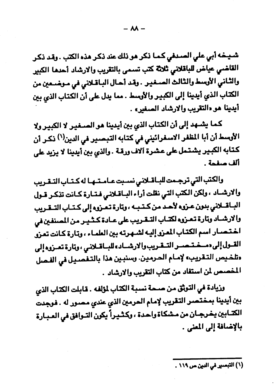 كما يشهد إلى أن الكتاب الذي بين أيدينا هو الصغير لا الكبير ولا الأوسط أن أبا المظفر الاسفرائيني في كتابه التبصير في الدين ذكر أن كتابه الكبير يشتمل على عشرة آلاف ورقة. والذي بين أيدينا لا يزيد على ألف صفحة.