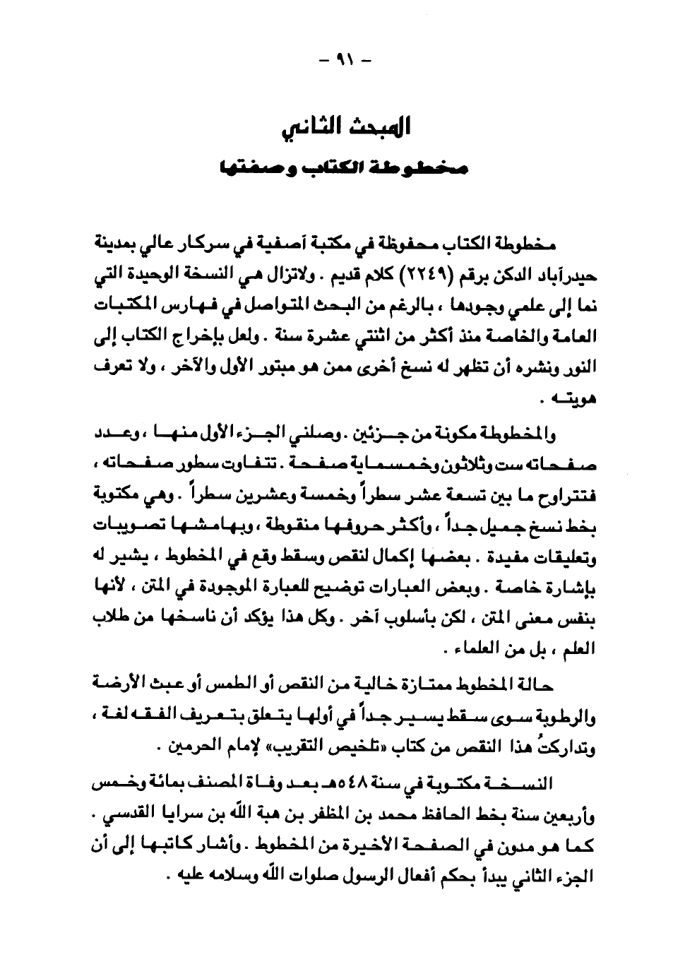 حالة المخطوط ممتازة خالية من النقص أو الطمس أو عبث الأرضة والرطوبة سوى سقط يسير جدًا في أولها يتعلق بتعريف الفقه لغة، وتداركت هذا النقص من كتاب "تلخيص التقريب" لإمام الحرمين.