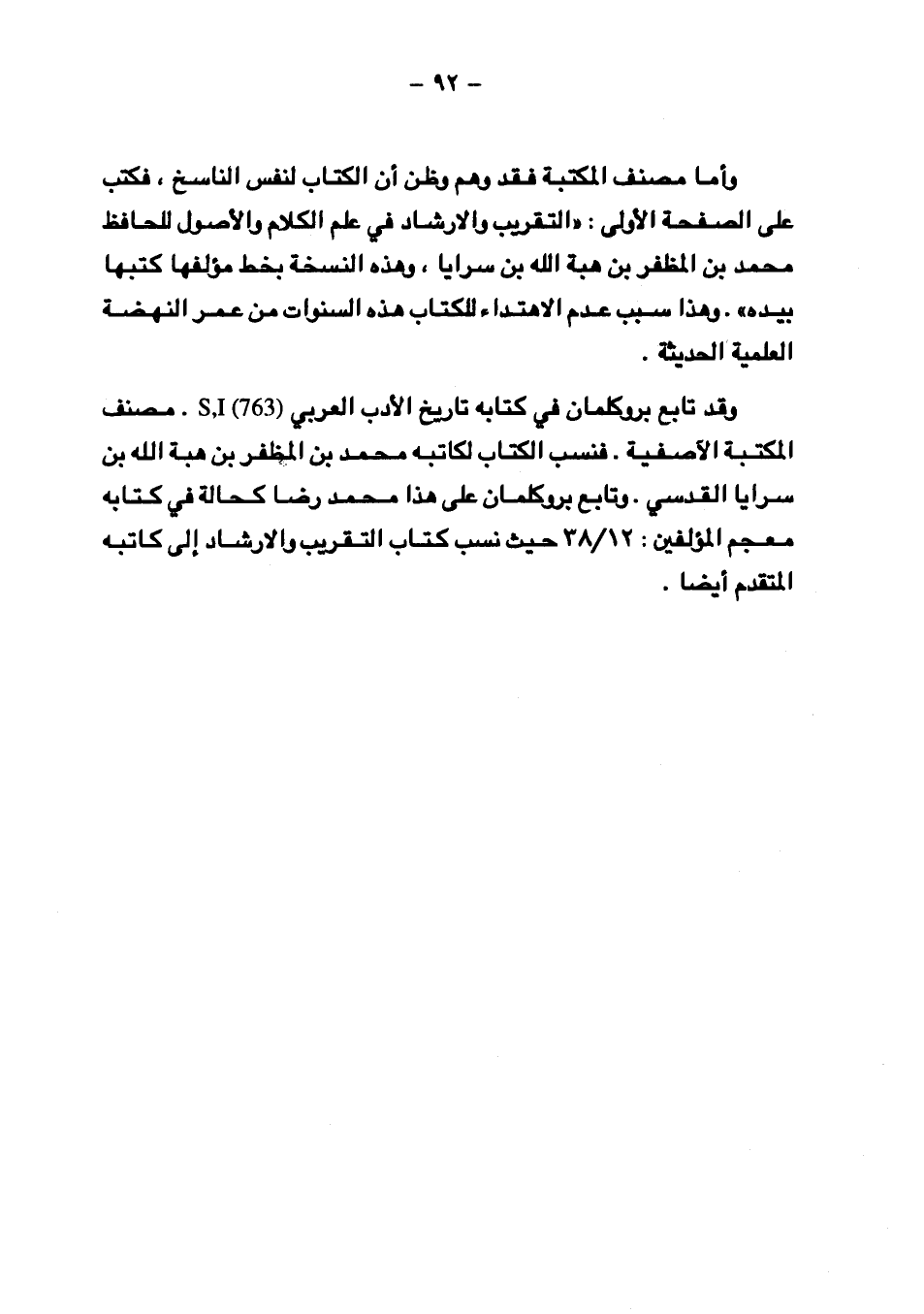 وأما مصنف المكتبة فقد وهم وظن أن الكتاب لنفس الناسخ، فكتب على الصفحة الأولى: "التقريب والإرشاد في علم الكلام والأصول للحافظ محمد بن المظفر بن هبة الله بن سرايا، وهذه النسخة بخط مؤلفها كتبها بيده" وهذا سبب عدم الاهتداء للكتاب هذه السنوات من عمر النهضة العلمية الحديثة.