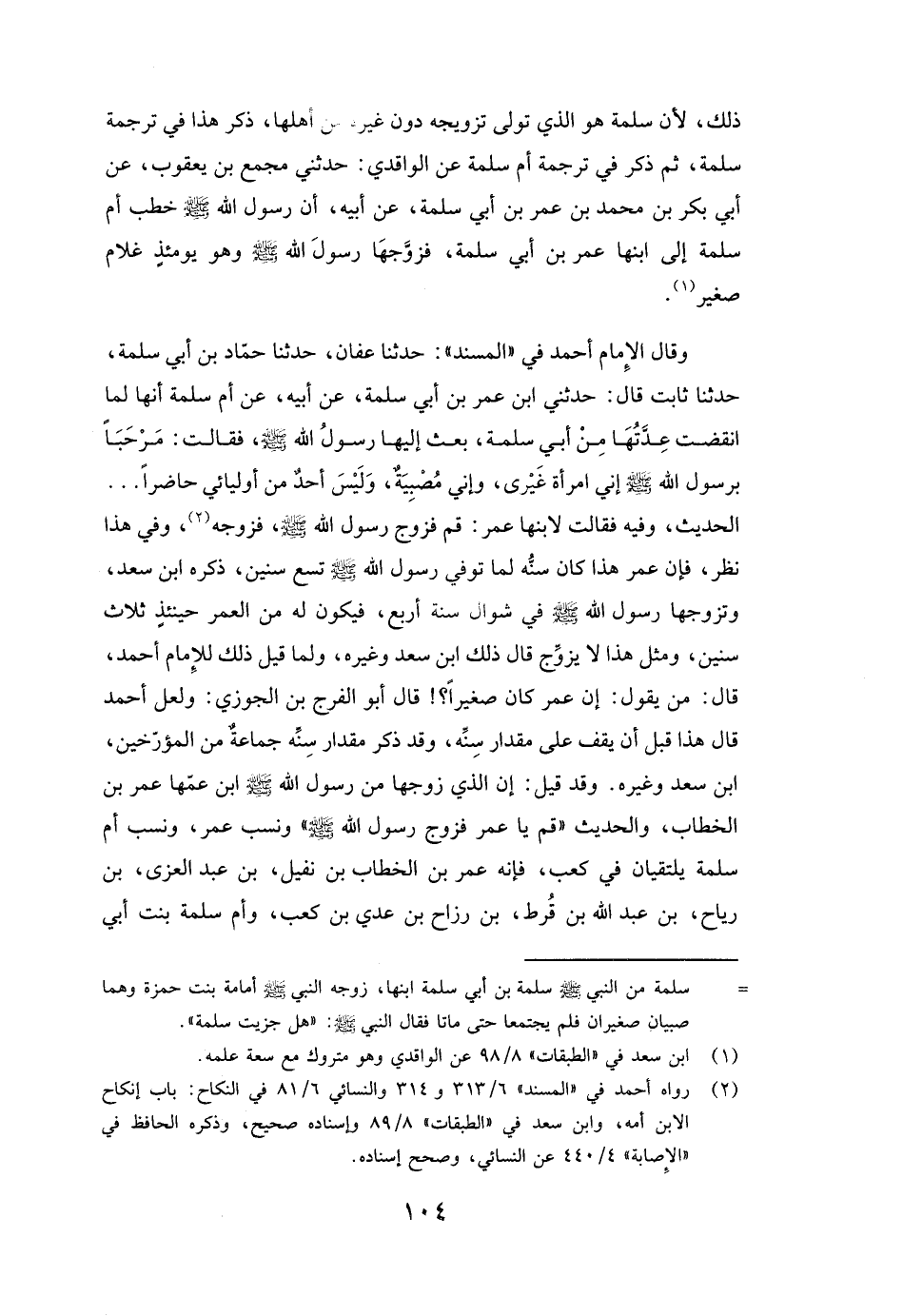 وَقَالَ الْإِمَامُ أَحْمَدُ فِي الْمُسْنَدِ: حَدَّثَنَا عفان، حَدَّثَنَا حماد بن أبي سلمة، حَدَّثَنَا ثابت، قَالَ حَدَّثَنِي ابن عمر بن أبي سلمة، عَنْ أَبِيهِ، «عَنْ أم سلمة أَنَّهَا لَمَّا انْقَضَتْ عِدَّتُهَا مِنْ أبي سلمة، بَعَثَ إِلَيْهَا رَسُولُ اللَّهِ صَلَّى اللَّهُ عَلَيْهِ وَسَلَّمَ فَقَالَتْ: مَرْحَبًا بِرَسُولِ اللَّهِ صَلَّى اللَّهُ عَلَيْهِ وَسَلَّمَ، إِنِّي امْرَأَةٌ غَيْرَى، وَإِنِّي مُصْبِيَةٌ وَلَيْسَ أَحَدٌ مِنْ أَوْلِيَائِي حَاضِرًا. . . الْحَدِيثَ، وَفِيهِ فَقَالَتْ لِابْنِهَا عمر: قُمْ فَزَوِّجْ رَسُولَ اللَّهِ صَلَّى اللَّهُ عَلَيْهِ وَسَلَّمَ فَزَوَّجَهُ» ، وَفِي هَذَا نَظَرٌ، فَإِنَّ عمر هَذَا كَانَ سِنُّهُ لَمَّا تُوُفِّيَ رَسُولُ اللَّهِ صَلَّى اللَّهُ عَلَيْهِ وَسَلَّمَ تِسْعَ سِنِينَ، ذَكَرَهُ ابن سعد، وَتَزَوَّجَهَا رَسُولُ اللَّهِ صَلَّى اللَّهُ عَلَيْهِ وَسَلَّمَ فِي شَوَّالٍ سَنَةَ أَرْبَعٍ، فَيَكُونُ لَهُ مِنَ الْعُمُرِ حِينَئِذٍ ثَلَاثُ سِنِينَ، وَمِثْلُ هَذَا لَا يُزَوِّجُ، قَالَ ذَلِكَ ابن سعد وَغَيْرُهُ، وَلَمَّا قِيلَ ذَلِكَ لِلْإِمَامِ أَحْمَدَ، قَالَ: مَنْ يَقُولُ إِنَّ عمر كَانَ صَغِيرًا؟ قَالَ أَبُو الْفَرَجِ بْنُ الْجَوْزِيِّ: وَلَعَلَّ أحمد قَالَ هَذَا قَبْلَ أَنْ يَقِفَ عَلَى مِقْدَارِ سِنِّهِ، وَقَدْ ذَكَرَ مِقْدَارَ سِنِّهِ جَمَاعَةٌ مِنَ الْمُؤَرِّخِينَ ابن سعد وَغَيْرُهُ.