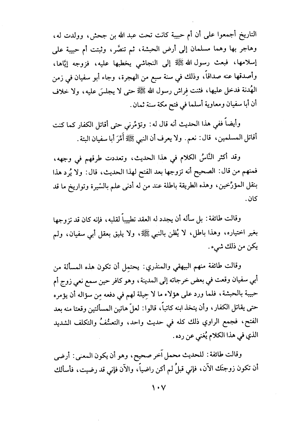 التَّارِيخِ أَجْمَعُوا عَلَى أَنَّ أم حبيبة كَانَتْ تَحْتَ عبد الله بن جحش، وَوَلَدَتْ لَهُ، وَهَاجَرَ بِهَا وَهُمَا مُسْلِمَانِ إِلَى أَرْضِ الْحَبَشَةِ، ثُمَّ تَنَصَّرَ وَثَبَتَتْ أم حبيبة عَلَى إِسْلَامِهَا فَبَعَثَ رَسُولُ اللَّهِ صَلَّى اللَّهُ عَلَيْهِ وَسَلَّمَ إِلَى النَّجَاشِيِّ يَخْطُبُهَا عَلَيْهِ فَزَوَّجَهُ إِيَّاهَا وَأَصْدَقَهَا عَنْهُ صَدَاقًا، وَذَلِكَ فِي سَنَةِ سَبْعٍ مِنَ الْهِجْرَةِ، وَجَاءَ أبو سفيان فِي زَمَنِ الْهُدْنَةِ فَدَخَلَ عَلَيْهَا، فَثَنَتْ فِرَاشَ رَسُولِ اللَّهِ صَلَّى اللَّهُ عَلَيْهِ وَسَلَّمَ حَتَّى لَا يَجْلِسَ عَلَيْهِ، وَلَا خِلَافَ أَنَّ أبا سفيان ومعاوية أَسْلَمَا فِي فَتْحِ مَكَّةَ سَنَةَ ثَمَانٍ.