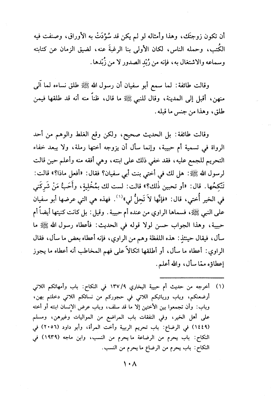 وَقَالَتْ طَائِفَةٌ: بَلِ الْحَدِيثُ صَحِيحٌ، وَلَكِنْ وَقَعَ الْغَلَطُ وَالْوَهْمُ مِنْ أَحَدِ الرُّوَاةِ فِي تَسْمِيَةِ أم حبيبة، وَإِنَّمَا سَأَلَ أَنْ يُزَوِّجَهُ أُخْتَهَا رملة، وَلَا يَبْعُدُ خَفَاءُ التَّحْرِيمِ لِلْجَمْعِ عَلَيْهِ، فَقَدَ خَفِيَ ذَلِكَ عَلَى ابْنَتِهِ وَهِيَ أَفْقَهُ مِنْهُ وَأَعْلَمُ حِينَ «قَالَتْ لِرَسُولِ اللَّهِ صَلَّى اللَّهُ عَلَيْهِ وَسَلَّمَ: هَلْ لَكَ فِي أُخْتِي بِنْتِ أبي سفيان؟ فَقَالَ أَفْعَلُ مَاذَا؟ قَالَتْ: تَنْكِحُهَا. قَالَ: أَوَتُحِبِّينَ ذَلِكَ؟ قَالَتْ لَسْتُ لَكَ بِمُخْلِيَةٍ، وَأَحَبُّ مَنْ شَرِكَنِي فِي الْخَيْرِ أُخْتِي، قَالَ: فَإِنَّهَا لَا تَحِلُّ لِي» . فَهَذِهِ هِيَ الَّتِي عَرَضَهَا أبو سفيان عَلَى النَّبِيِّ صَلَّى اللَّهُ عَلَيْهِ وَسَلَّمَ، فَسَمَّاهَا الرَّاوِي مِنْ عِنْدِهِ أم حبيبة، وَقِيلَ: بَلْ كَانَتْ كُنْيَتُهَا أَيْضًا أم حبيبة، وَهَذَا الْجَوَابُ حَسَنٌ لَوْلَا قَوْلُهُ فِي الْحَدِيثِ: فَأَعْطَاهُ رَسُولُ اللَّهِ صَلَّى اللَّهُ عَلَيْهِ وَسَلَّمَ مَا سَأَلَ، فَيُقَالُ حِينَئِذٍ هَذِهِ اللَّفْظَةُ وَهْمٌ مِنَ الرَّاوِي، فَإِنَّهُ أَعْطَاهُ بَعْضَ مَا سَأَلَ، فَقَالَ الرَّاوِي: أَعْطَاهُ مَا سَأَلَ أَوْ أَطْلَقَهَا اتِّكَالًا عَلَى فَهْمِ الْمُخَاطَبِ أَنَّهُ أَعْطَاهُ مَا يَجُوزُ إِعْطَاؤُهُ مِمَّا سَأَلَ، وَاللَّهُ أَعْلَمُ.
