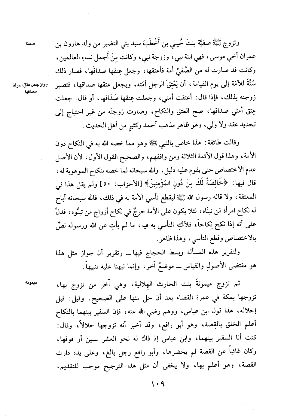 وَتَزَوَّجَ صَلَّى اللَّهُ عَلَيْهِ وَسَلَّمَ صفية بنت حيي بن أخطب سَيِّدِ بَنِي النَّضِيرِ مِنْ وَلَدِ هَارُونَ بْنِ عِمْرَانَ أَخِي مُوسَى، فَهِيَ ابْنَةُ نَبِيٍّ، وَزَوْجَةُ نَبِيٍّ، وَكَانَتْ مِنْ أَجْمَلِ نِسَاءِ الْعَالَمِينَ، وَكَانَتْ قَدْ صَارَتْ لَهُ مِنَ الصَّفِيِّ أَمَةً فَأَعْتَقَهَا، وَجَعَلَ عِتْقَهَا صَدَاقَهَا، فَصَارَ ذَلِكَ سُنَّةً لِلْأُمَّةِ إِلَى يَوْمِ الْقِيَامَةِ أَنْ يَعْتِقَ الرَّجُلُ أَمَتَهُ وَيَجْعَلَ عِتْقَهَا صَدَاقَهَا فَتَصِيرَ زَوْجَتَهُ بِذَلِكَ، فَإِذَا قَالَ: أَعْتَقْتُ أَمَتِي، وَجَعَلْتُ عِتْقَهَا صَدَاقَهَا، أَوْ قَالَ: جَعَلْتُ عِتْقَ أَمَتِي صَدَاقَهَا، صَحَّ الْعِتْقُ وَالنِّكَاحُ، وَصَارَتْ زَوْجَتَهُ مِنْ غَيْرِ احْتِيَاجٍ إِلَى تَجْدِيدِ عَقْدٍ وَلَا وَلِيٍّ، وَهُوَ ظَاهِرُ مَذْهَبِ أحمد، وَكَثِيرٍ مِنْ أَهْلِ الْحَدِيثِ.