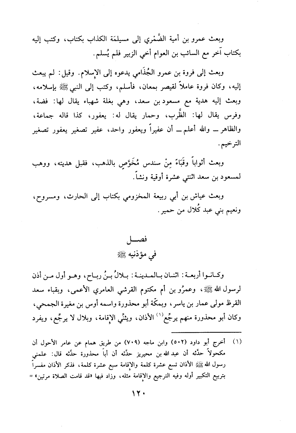 وَكَانُوا أَرْبَعَةً: اثْنَانِ بِالْمَدِينَةِ: بِلَالُ بْنُ رَبَاحٍ، وَهُوَ أَوَّلُ مَنْ أَذَّنَ لِرَسُولِ اللَّهِ صَلَّى اللَّهُ عَلَيْهِ وَسَلَّمَ، وعمرو بن أم مكتوم القرشي العامري الأعمى، وَبِقُبَاءٍ: سعد القرظ مَوْلَى عَمَّارِ بْنِ يَاسِرٍ، وَبِمَكَّةَ: أبو محذورة، واسمه أوس بن مغيرة الجمحي، وَكَانَ أَبُو مَحْذُورَةَ مِنْهُمْ يُرَجِّعُ الْأَذَانَ، وَيُثَنِّي الْإِقَامَةَ، وبلال لَا يُرَجِّعُ، وَيُفْرِدُ