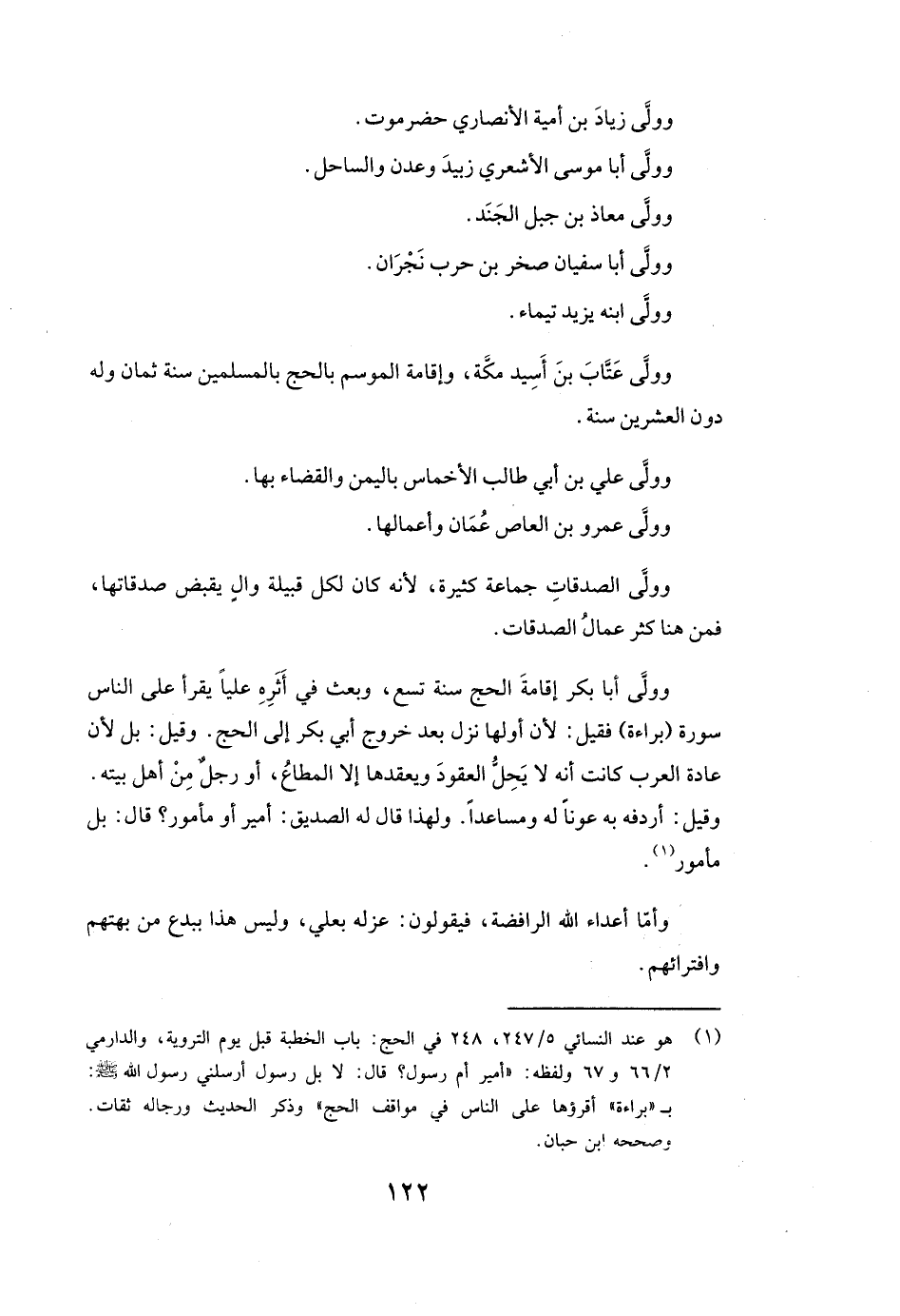 وَوَلَّى أبا بكر إِقَامَةَ الْحَجِّ سَنَةَ تِسْعٍ، وَبَعَثَ فِي إِثْرِهِ عليا يَقْرَأُ عَلَى النَّاسِ سُورَةَ (بَرَاءَةَ) فَقِيلَ: لِأَنَّ أَوَّلَهَا نَزَلَ بَعْدَ خُرُوجِ أبي بكر إِلَى الْحَجِّ. وَقِيلَ: بَلْ لِأَنَّ عَادَةَ الْعَرَبِ كَانَتْ أَنَّهُ لَا يَحِلُّ الْعُقُودَ وَيَعْقِدُهَا إِلَّا الْمُطَاعُ، أَوْ رَجُلٌ مِنْ أَهْلِ بَيْتِهِ. وَقِيلَ: أَرْدَفَهُ بِهِ عَوْنًا لَهُ وَمُسَاعِدًا. وَلِهَذَا قَالَ لَهُ الصِّدِّيقُ: (أَمِيرٌ أَوْ مَأْمُورٌ؟ قَالَ: بَلْ مَأْمُورٌ) .