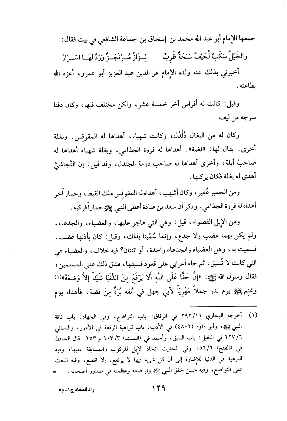 وَمِنَ الْإِبِلِ الْقَصْوَاءُ، قِيلَ: وَهِيَ الَّتِي هَاجَرَ عَلَيْهَا، وَالْعَضْبَاءُ، وَالْجَدْعَاءُ، وَلَمْ يَكُنْ بِهِمَا عَضَبٌ وَلَا جَدْعٌ، وَإِنَّمَا سُمِّيَتَا بِذَلِكَ، وَقِيلَ: كَانَ بِأُذُنِهَا عَضَبٌ فَسُمِّيَتْ بِهِ، وَهَلِ الْعَضْبَاءُ وَالْجَدْعَاءُ وَاحِدَةٌ، أَوِ اثْنَتَانِ؟ فِيهِ خِلَافٌ، وَالْعَضْبَاءُ هِيَ الَّتِي كَانَتْ لَا تُسْبَقُ، ثُمَّ جَاءَ أَعْرَابِيٌّ عَلَى قَعُودٍ فَسَبَقَهَا، فَشَقَّ ذَلِكَ عَلَى الْمُسْلِمِينَ، فَقَالَ رَسُولُ اللَّهِ صَلَّى اللَّهُ عَلَيْهِ وَسَلَّمَ ( «إِنَّ حَقًّا عَلَى اللَّهِ أَلَّا يَرْفَعَ مِنَ الدُّنْيَا شَيْئًا إِلَّا وَضَعَهُ» ) وَغَنِمَ صَلَّى اللَّهُ عَلَيْهِ وَسَلَّمَ يَوْمَ بَدْرٍ جَمَلًا مَهْرِيًّا لأبي جهل فِي أَنْفِهِ بُرَةٌ مِنْ فِضَّةٍ، فَأَهْدَاهُ يَوْمَ