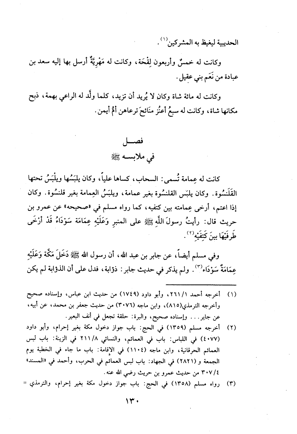 كَانَتْ لَهُ عِمَامَةٌ تُسَمَّى: السَّحَابَ كَسَاهَا عَلِيًّا، وَكَانَ يَلْبَسُهَا وَيَلْبَسُ تَحْتَهَا الْقَلَنْسُوَةَ. وَكَانَ يَلْبَسُ الْقَلَنْسُوَةَ بِغَيْرِ عِمَامَةٍ، وَيَلْبَسُ الْعِمَامَةَ بِغَيْرِ قَلَنْسُوَةٍ.