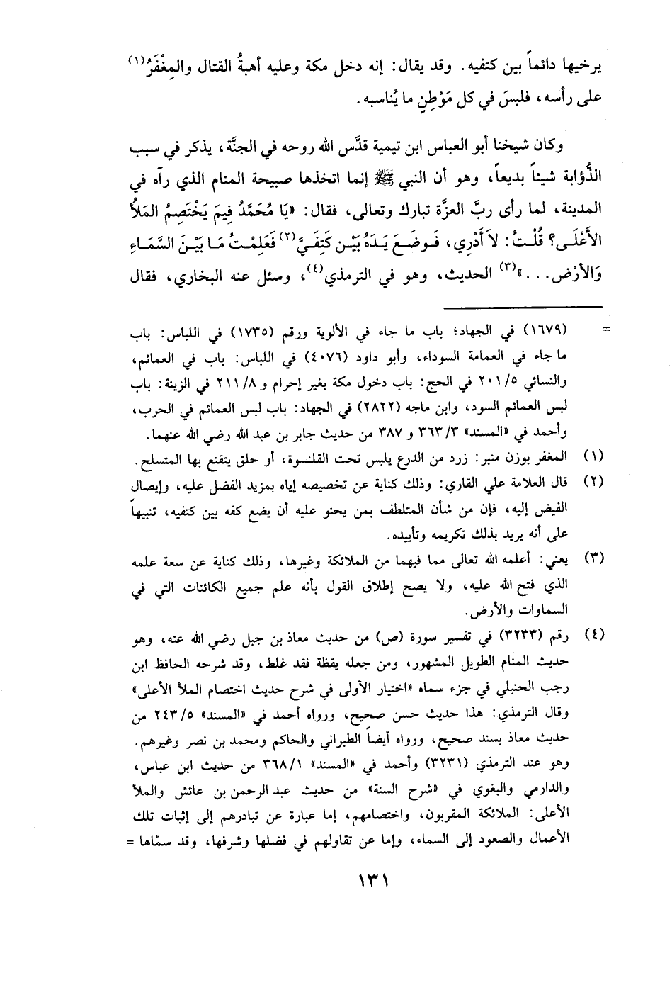 وَكَانَ شَيْخُنَا أبو العباس ابن تيمية قَدَّسَ اللَّهُ رُوحَهُ فِي الْجَنَّةِ يَذْكُرُ فِي سَبَبِ الذُّؤَابَةِ شَيْئًا بَدِيعًا، وَهُوَ أَنَّ النَّبِيَّ صَلَّى اللَّهُ عَلَيْهِ وَسَلَّمَ إِنَّمَا اتَّخَذَهَا صَبِيحَةَ الْمَنَامِ الَّذِي رَآهُ فِي الْمَدِينَةِ «لَمَّا رَأَى رَبَّ الْعِزَّةِ تَبَارَكَ وَتَعَالَى، فَقَالَ: " يَا مُحَمَّدُ فِيمَ يَخْتَصِمُ الْمَلَأُ الْأَعْلَى؟ قُلْتُ: لَا أَدْرِي، فَوَضَعَ يَدَهُ بَيْنَ كَتِفَيَّ فَعَلِمْتُ مَا بَيْنَ السَّمَاءِ وَالْأَرْضِ» . . . " الْحَدِيثَ، وَهُوَ فِي الترمذي، وَسُئِلَ عَنْهُ الْبُخَارِيُّ، فَقَالَ