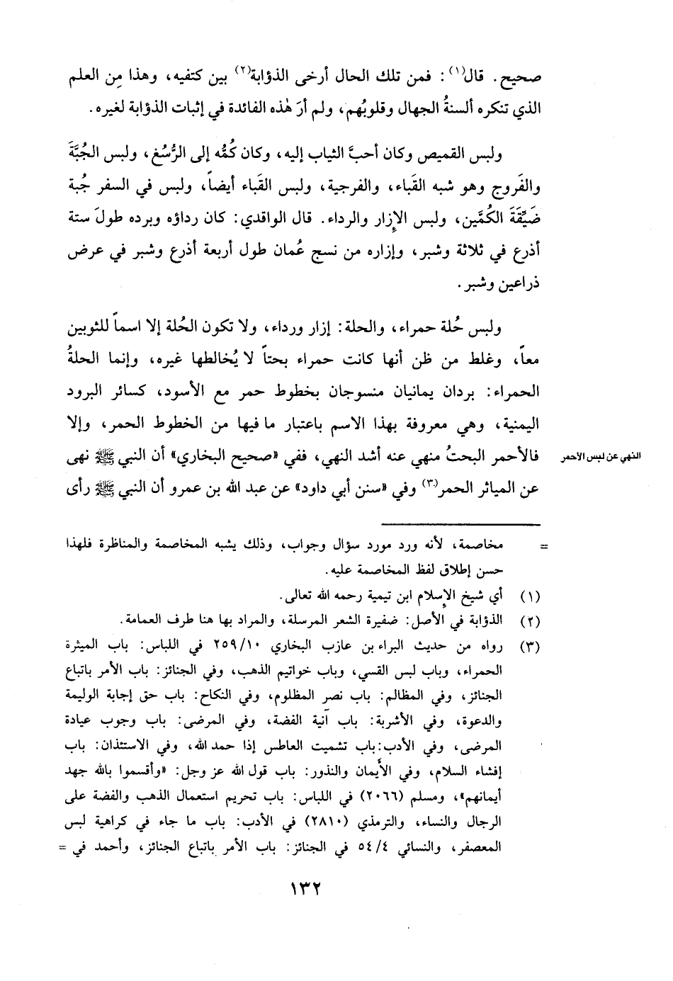 وَلَبِسَ حُلَّةً حَمْرَاءَ، وَالْحُلَّةُ إِزَارٌ وَرِدَاءٌ، وَلَا تَكُونُ الْحُلَّةُ إِلَّا اسْمًا لِلثَّوْبَيْنِ مَعًا، وَغَلِطَ مَنْ ظَنَّ أَنَّهَا كَانَتْ حَمْرَاءَ بَحْتًا لَا يُخَالِطُهَا غَيْرُهُ، وَإِنَّمَا الْحُلَّةُ الْحَمْرَاءُ: بُرْدَانِ يَمَانِيَّانِ مَنْسُوجَانِ بِخُطُوطٍ حُمْرٍ مَعَ الْأَسْوَدِ، كَسَائِرِ الْبُرُودِ الْيَمَنِيَّةِ، وَهِيَ مَعْرُوفَةٌ بِهَذَا الِاسْمِ بِاعْتِبَارِ مَا فِيهَا مِنَ الْخُطُوطِ الْحُمْرِ، وَإِلَّا فَالْأَحْمَرُ الْبَحْتُ مَنْهِيٌّ عَنْهُ أَشَدَّ النَّهْيِ فَفِي "صَحِيحِ الْبُخَارِيِّ " أَنَّ النَّبِيَّ صَلَّى اللَّهُ عَلَيْهِ وَسَلَّمَ ( «نَهَى عَنِ الْمَيَاثِرِ الْحُمْرِ» ) وَفِي "سُنَنِ أبي داود " عَنْ عَبْدِ اللَّهِ بْنِ عَمْرٍو أَنَّ النَّبِيَّ صَلَّى اللَّهُ عَلَيْهِ وَسَلَّمَ رَأَى