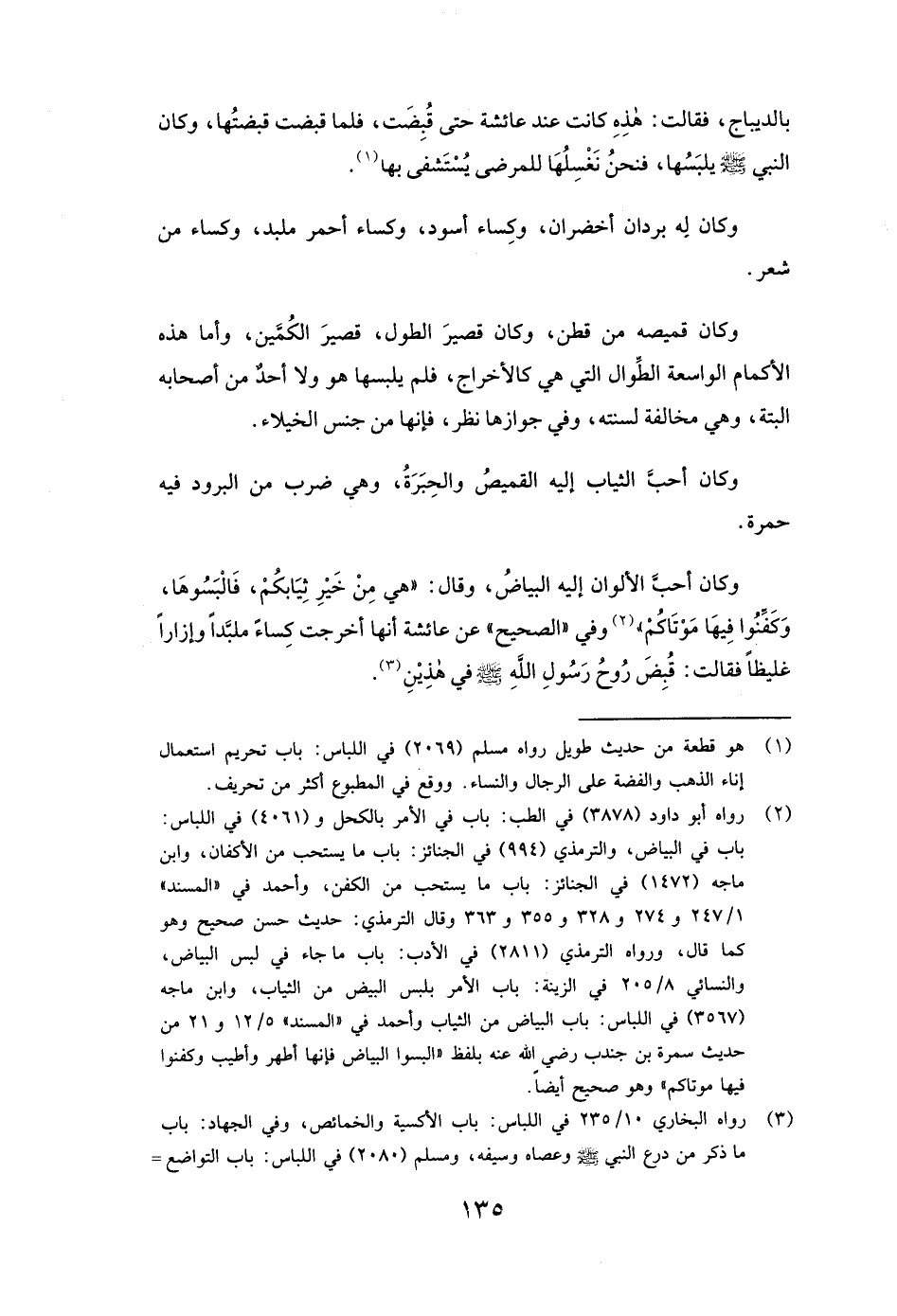 وَكَانَ أَحَبَّ الْأَلْوَانِ إِلَيْهِ الْبَيَاضُ، وَقَالَ ( «هِيَ مِنْ خَيْرِ ثِيَابِكُمْ فَالْبَسُوهَا وَكَفِّنُوا فِيهَا مَوْتَاكُمْ» ) وَفِي الصَّحِيحِ «عَنْ عائشة أَنَّهَا أَخْرَجَتْ كِسَاءً مُلَبَّدًا وَإِزَارًا غَلِيظًا فَقَالَتْ قُبِضَ رُوحُ رَسُولِ اللَّهِ صَلَّى اللَّهُ عَلَيْهِ وَسَلَّمَ فِي هَذَيْنِ» .