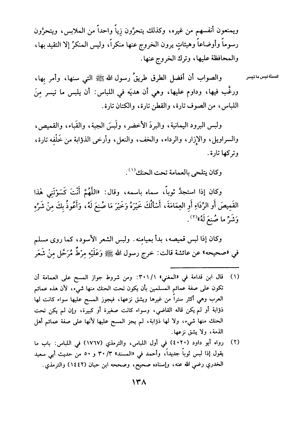 وَالصَّوَابُ: أَنَّ أَفْضَلَ الطُّرُقِ طَرِيقُ رَسُولِ اللَّهِ صَلَّى اللَّهُ عَلَيْهِ وَسَلَّمَ الَّتِي سَنَّهَا وَأَمَرَ بِهَا وَرَغَّبَ فِيهَا وَدَاوَمَ عَلَيْهَا، وَهِيَ أَنَّ هَدْيَهُ فِي اللِّبَاسِ أَنْ يَلْبَسَ مَا تَيَسَّرَ مِنَ اللِّبَاسِ مِنَ الصُّوفِ تَارَةً وَالْقُطْنِ تَارَةً وَالْكَتَّانِ تَارَةً.
