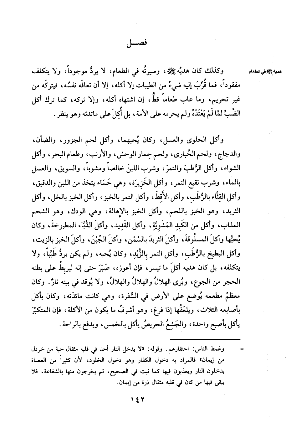 وَكَذَلِكَ كَانَ هَدْيُهُ صَلَّى اللَّهُ عَلَيْهِ وَسَلَّمَ وَسِيرَتُهُ فِي الطَّعَامِ لَا يَرُدُّ مَوْجُودًا وَلَا يَتَكَلَّفُ مَفْقُودًا، فَمَا قُرِّبَ إِلَيْهِ شَيْءٌ مِنَ الطَّيِّبَاتِ إِلَّا أَكَلَهُ، إِلَّا أَنْ تَعَافَهُ نَفْسُهُ فَيَتْرُكَهُ مِنْ غَيْرِ تَحْرِيمٍ ( «وَمَا عَابَ طَعَامًا قَطُّ، إِنِ اشْتَهَاهُ أَكَلَهُ وَإِلَّا تَرَكَهُ» ) كَمَا تَرَكَ أَكْلَ الضَّبِّ لَمَّا لَمْ يَعْتَدْهُ، وَلَمْ يُحَرِّمْهُ عَلَى الْأُمَّةِ، بَلْ أُكِلَ عَلَى مَائِدَتِهِ وَهُوَ يَنْظُرُ.