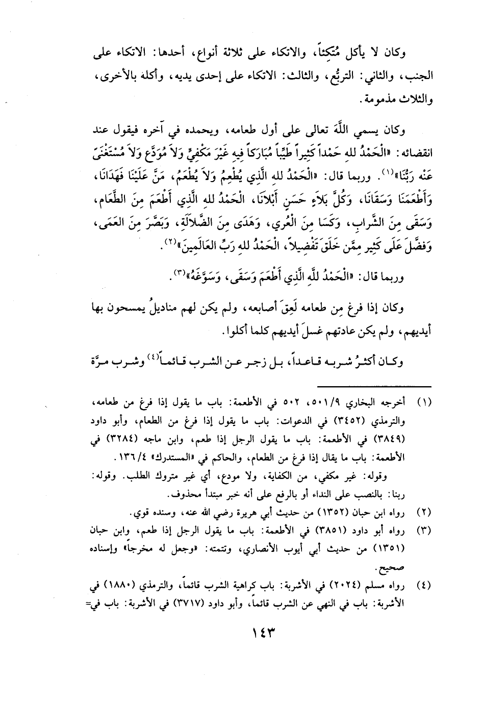 وَكَانَ يُسَمِّي اللَّهَ تَعَالَى عَلَى أَوَّلِ طَعَامِهِ، وَيَحْمَدُهُ فِي آخِرِهِ فَيَقُولُ عِنْدَ انْقِضَائِهِ: ( «الْحَمْدُ لِلَّهِ حَمْدًا كَثِيرًا طَيِّبًا مُبَارَكًا فِيهِ غَيْرَ مَكْفِيٍّ وَلَا مُوَدَّعٍ وَلَا مُسْتَغْنًى عَنْهُ رَبُّنَا» ) . وَرُبَّمَا قَالَ: ( «الْحَمْدُ لِلَّهِ الَّذِي يُطْعِمُ وَلَا يُطْعَمُ، مَنَّ عَلَيْنَا فَهَدَانَا وَأَطْعَمَنَا وَسَقَانَا وَكُلَّ بَلَاءٍ حَسَنٍ أَبْلَانَا، الْحَمْدُ لِلَّهِ الَّذِي أَطْعَمَ مِنَ الطَّعَامِ، وَسَقَى مِنَ الشَّرَابِ، وَكَسَا مِنَ الْعُرْيِ، وَهَدَى مِنَ الضَّلَالَةِ وَبَصَّرَ مِنَ الْعَمَى، وَفَضَّلَ عَلَى كَثِيرٍ مِمَّنْ خَلَقَ تَفْضِيلًا، الْحَمْدُ لِلَّهِ رَبِّ الْعَالَمِينَ» ) .