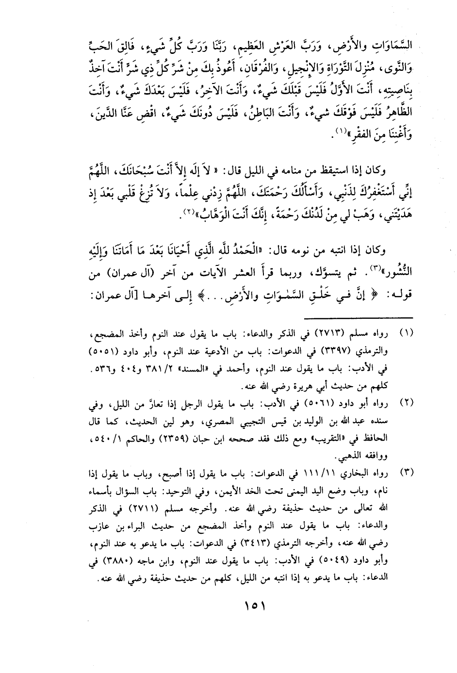وَكَانَ إِذَا اسْتَيْقَظَ مِنْ مَنَامِهِ فِي اللَّيْلِ قَالَ: ( «لَا إِلَهَ إِلَّا أَنْتَ سُبْحَانَكَ اللَّهُمَّ إِنِّي أَسْتَغْفِرُكَ لِذَنْبِي، وَأَسْأَلُكَ رَحْمَتَكَ، اللَّهُمَّ زِدْنِي عِلْمًا وَلَا تُزِغْ قَلْبِي بَعْدَ إِذْ هَدَيْتَنِي، وَهَبْ لِي مِنْ لَدُنْكَ رَحْمَةً إِنَّكَ أَنْتَ الْوَهَّابُ» )