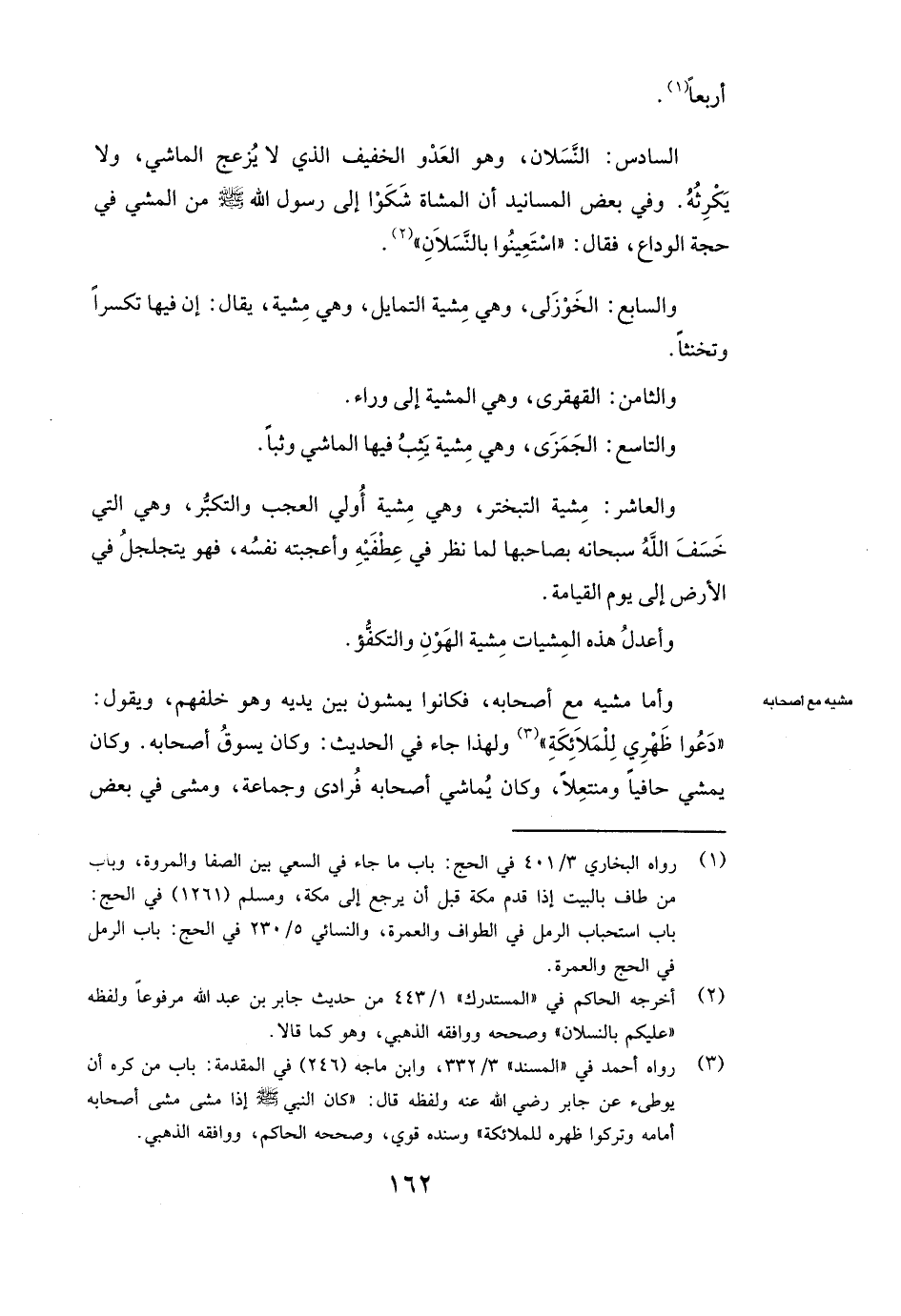 وَأَمَّا مَشْيُهُ مَعَ أَصْحَابِهِ فَكَانُوا يَمْشُونَ بَيْنَ يَدَيْهِ وَهُوَ خَلْفَهُمْ وَيَقُولُ: (دَعُوا ظَهْرِي لِلْمَلَائِكَةِ) وَلِهَذَا جَاءَ فِي الْحَدِيثِ: وَكَانَ يَسُوقُ أَصْحَابَهُ. وَكَانَ يَمْشِي حَافِيًا وَمُنْتَعِلًا، وَكَانَ يُمَاشِي أَصْحَابَهُ فُرَادَى وَجَمَاعَةً، «وَمَشَى فِي بَعْضِ