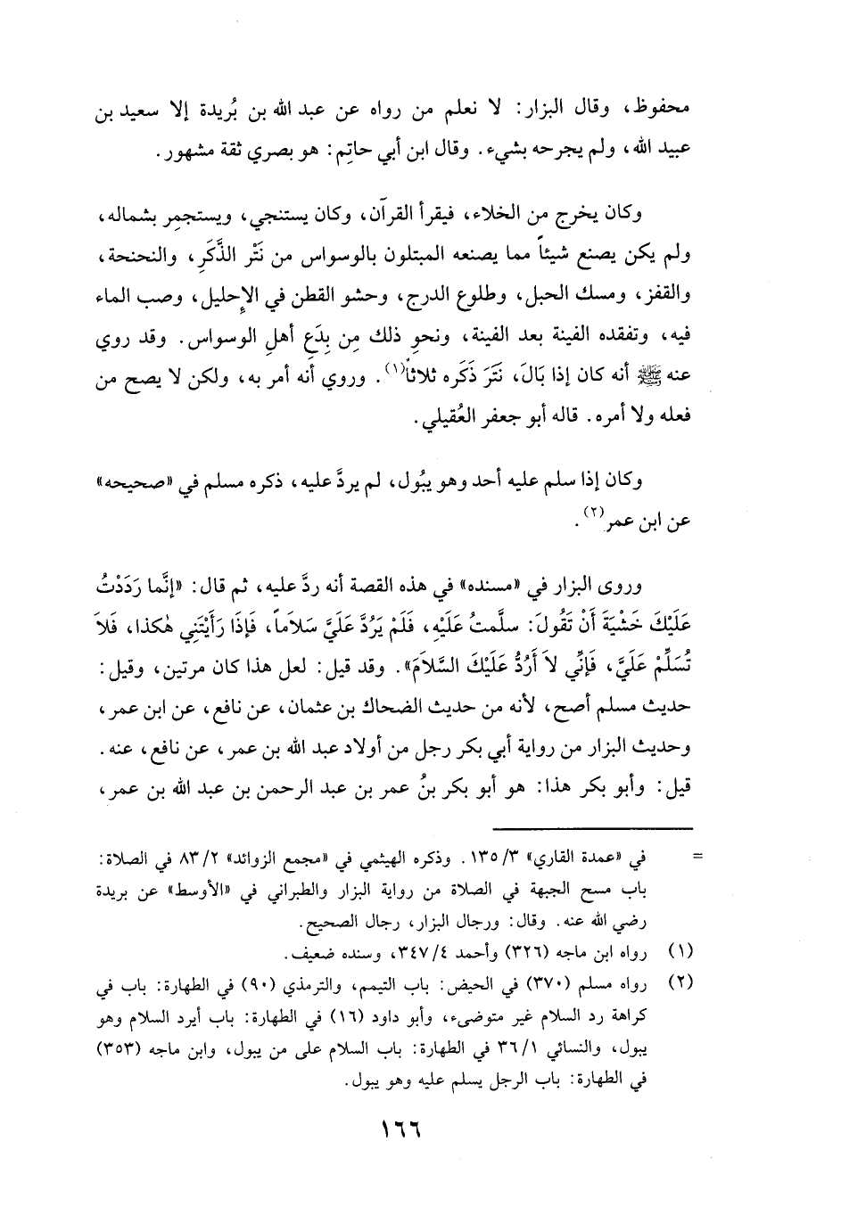 ( «وَكَانَ إِذَا سَلَّمَ عَلَيْهِ أَحَدٌ وَهُوَ يَبُولُ لَمْ يَرُدَّ عَلَيْهِ» ) ذَكَرَهُ مسلم فِي صَحِيحِهِ عَنِ ابْنِ عُمَرَ. وَرَوَى البزار فِي مُسْنَدِهِ فِي هَذِهِ الْقِصَّةِ أَنَّهُ ( «رَدَّ عَلَيْهِ ثُمَّ قَالَ: إِنَّمَا رَدَدْتُ عَلَيْكَ خَشْيَةَ أَنْ تَقُولَ سَلَّمْتُ عَلَيْهِ فَلَمْ يَرُدَّ عَلَيَّ سَلَامًا، فَإِذَا رَأَيْتَنِي هَكَذَا فَلَا تُسَلِّمْ عَلَيَّ فَإِنِّي لَا أَرُدُّ عَلَيْكَ السَّلَامَ» )