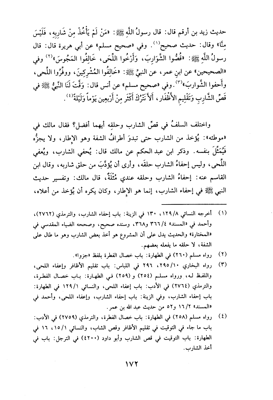 حَدِيثِ زَيْدِ بْنِ أَرْقَمَ قَالَ: قَالَ رَسُولُ اللَّهِ صَلَّى اللَّهُ عَلَيْهِ وَسَلَّمَ: ( «مَنْ لَمْ يَأْخُذْ مِنْ شَارِبِهِ فَلَيْسَ مِنَّا» ) وَقَالَ: حَدِيثٌ صَحِيحٌ. وَفِي صَحِيحِ مسلم عَنْ أَبِي هُرَيْرَةَ قَالَ: قَالَ رَسُولُ اللَّهِ صَلَّى اللَّهُ عَلَيْهِ وَسَلَّمَ: ( «قُصُّوا الشَّوَارِبَ وَأَرْخُوا اللِّحَى خَالِفُوا الْمَجُوسَ» ) . وَفِي الصَّحِيحَيْنِ عَنِ ابْنِ عُمَرَ، عَنِ النَّبِيِّ صَلَّى اللَّهُ عَلَيْهِ وَسَلَّمَ: ( «خَالِفُوا الْمُشْرِكِينَ وَوَفِّرُوا اللِّحَى وَأَحْفُوا الشَّوَارِبَ» ) ، وَفِي صَحِيحِ مسلم عَنْ أنس قَالَ: ( «وَقَّتَ لَنَا النَّبِيُّ صَلَّى اللَّهُ عَلَيْهِ وَسَلَّمَ فِي قَصِّ الشَّارِبِ وَتَقْلِيمِ الْأَظْفَارِ أَلَّا نَتْرُكَ أَكْثَرَ مِنْ أَرْبَعِينَ يَوْمًا وَلَيْلَةً» )