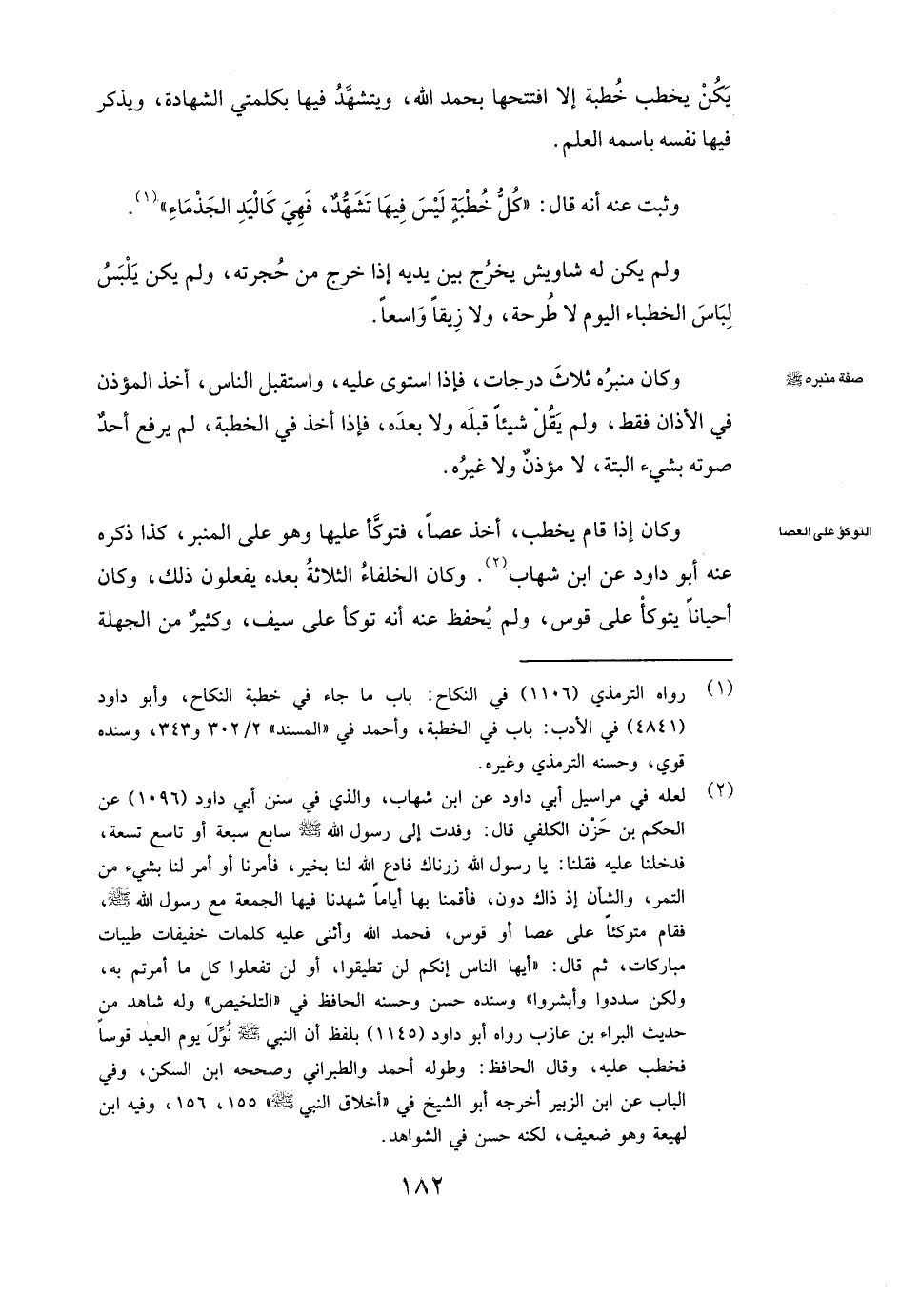 «وَكَانَ إِذَا قَامَ يَخْطُبُ أَخَذَ عَصًا فَتَوَكَّأَ عَلَيْهَا وَهُوَ عَلَى الْمِنْبَرِ» ، كَذَا ذَكَرَهُ عَنْهُ أبو داود عَنِ ابْنِ شِهَابٍ. وَكَانَ الْخُلَفَاءُ الثَّلَاثَةُ بَعْدَهُ يَفْعَلُونَ ذَلِكَ، وَكَانَ أَحْيَانًا يَتَوَكَّأُ عَلَى قَوْسٍ، وَلَمْ يُحْفَظْ عَنْهُ أَنَّهُ تَوَكَّأَ عَلَى سَيْفٍ، وَكَثِيرٌ مِنَ الْجَهَلَةِ
