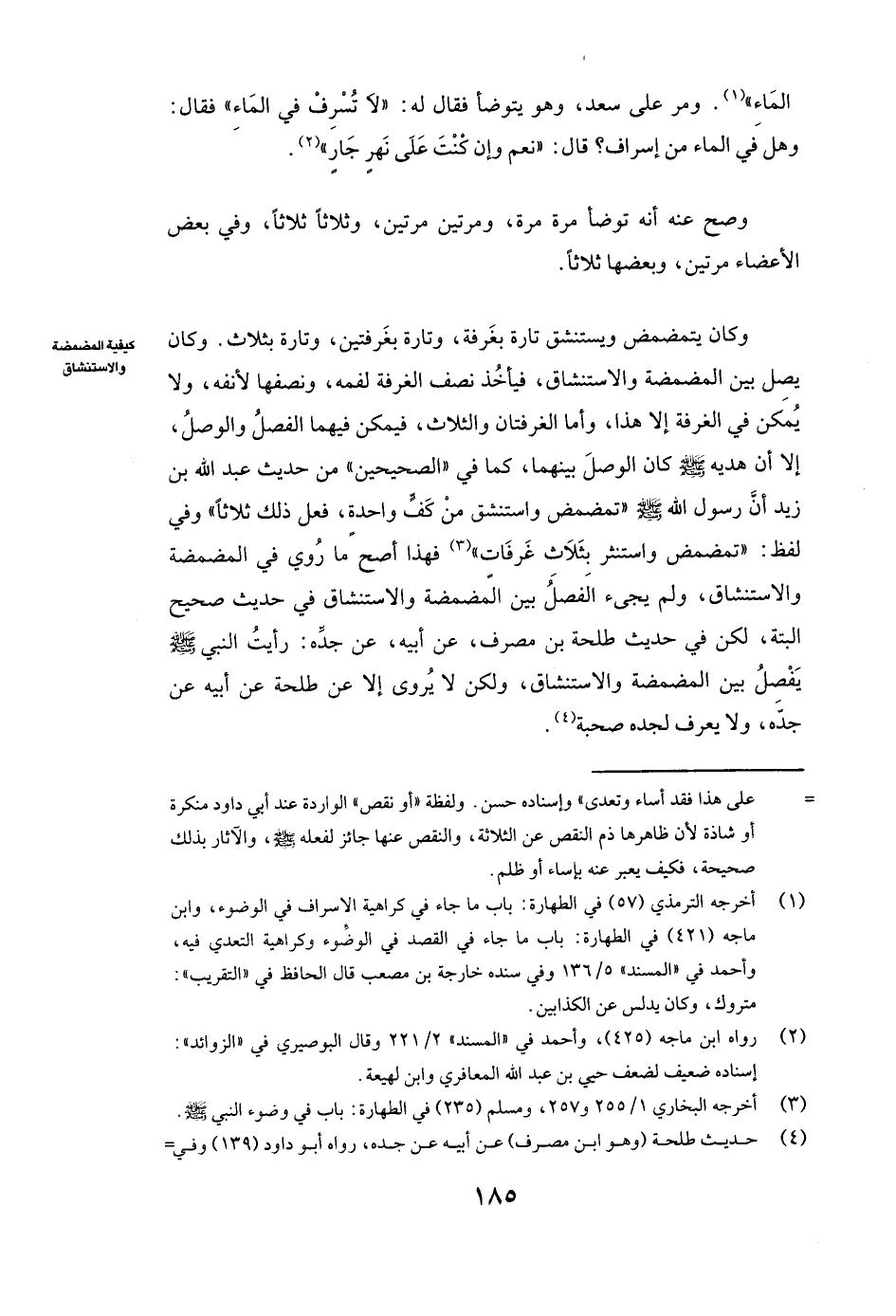 «وَمَرَّ عَلَى سعد وَهُوَ يَتَوَضَّأُ فَقَالَ لَهُ: (لَا تُسْرِفْ فِي الْمَاءِ، فَقَالَ: وَهَلْ فِي الْمَاءِ مِنْ إِسْرَافٍ؟ قَالَ: نَعَمْ، وَإِنْ كُنْتَ عَلَى نَهْرٍ جَارٍ» ) .