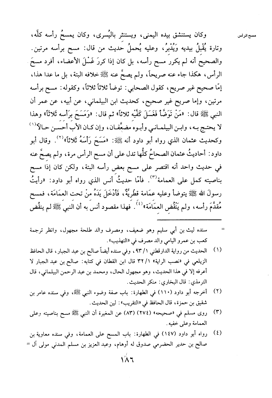 وَقَالَ أبو داود: أَحَادِيثُ عثمان الصِّحَاحُ كُلُّهَا تَدُلُّ عَلَى أَنَّ مَسْحَ الرَّأْسِ مَرَّةٌ، وَلَمْ يَصِحَّ عَنْهُ فِي حَدِيثٍ وَاحِدٍ أَنَّهُ اقْتَصَرَ عَلَى مَسْحِ بَعْضِ رَأْسِهِ الْبَتَّةَ، وَلَكِنْ كَانَ إِذَا مَسَحَ بِنَاصِيَتِهِ كَمَّلَ عَلَى الْعِمَامَةِ.