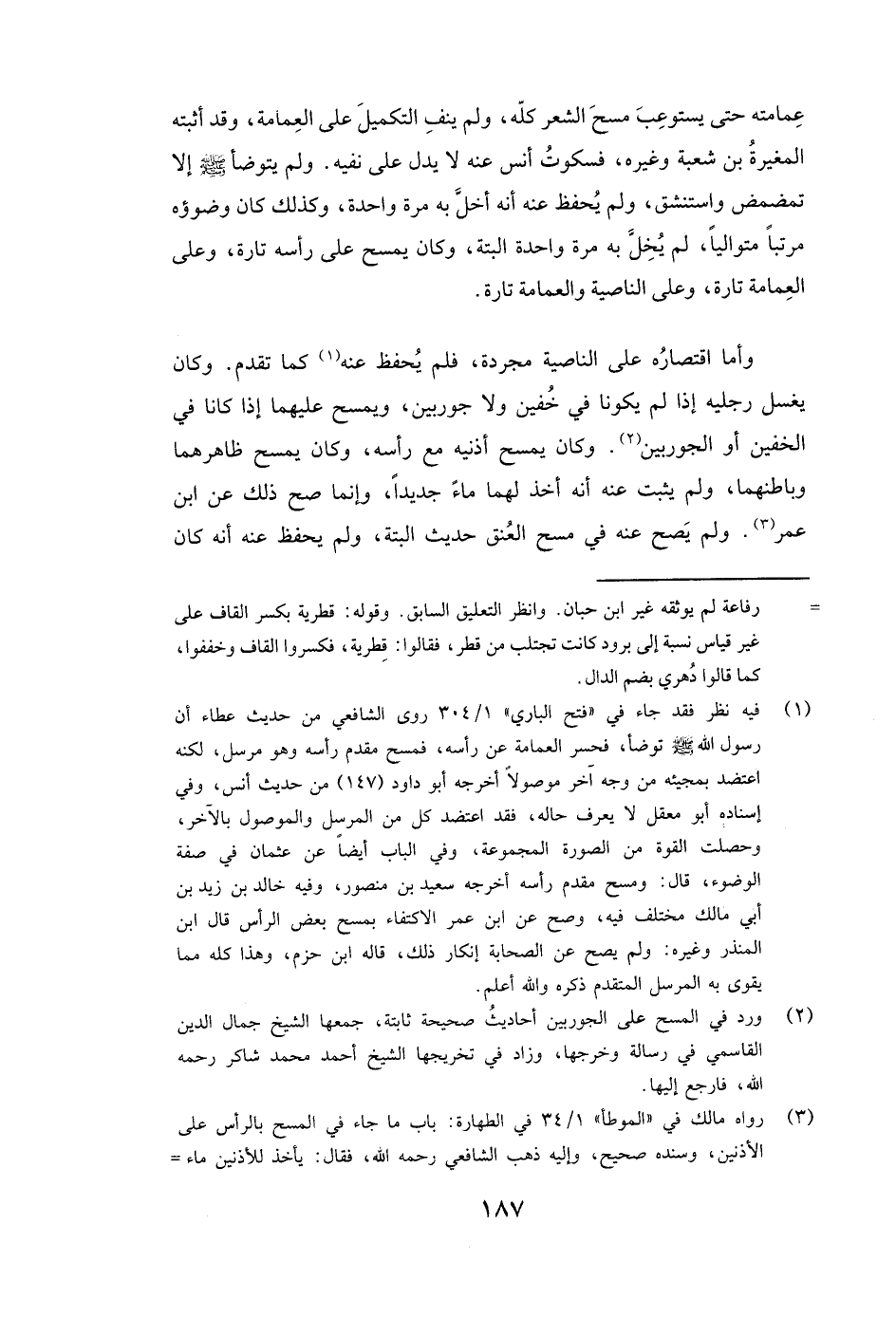 وَأَمَّا اقْتِصَارُهُ عَلَى النَّاصِيَةِ مُجَرَّدَةً فَلَمْ يُحْفَظْ عَنْهُ كَمَا تَقَدَّمَ. وَكَانَ يَغْسِلُ رِجْلَيْهِ إِذَا لَمْ يَكُونَا فِي خُفَّيْنِ وَلَا جَوْرَبَيْنِ، وَيَمْسَحُ عَلَيْهِمَا إِذَا كَانَا فِي الْخُفَّيْنِ أَوِ الْجَوْرَبَيْنِ. وَكَانَ يَمْسَحُ أُذُنَيْهِ مَعَ رَأْسِهِ، وَكَانَ يَمْسَحُ ظَاهِرَهُمَا وَبَاطِنَهُمَا، وَلَمْ يَثْبُتْ عَنْهُ أَنَّهُ أَخَذَ لَهُمَا مَاءً جَدِيدًا، وَإِنَّمَا صَحَّ ذَلِكَ عَنِ ابْنِ عُمَرَ.