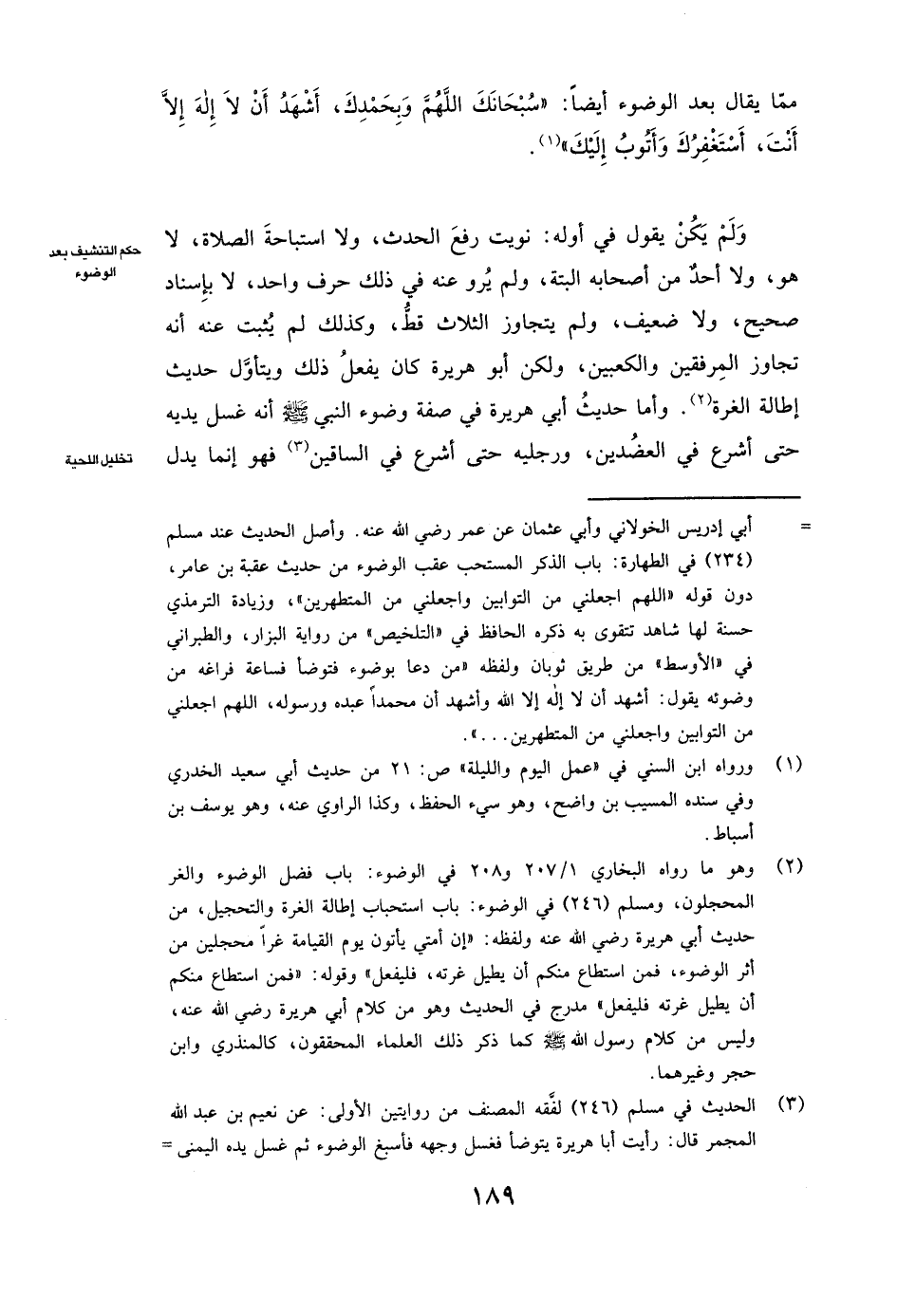 وَلَمْ يَكُنْ يَقُولُ فِي أَوَّلِهِ: نَوَيْتُ رَفْعَ الْحَدَثِ وَلَا اسْتِبَاحَةَ الصَّلَاةِ، لَا هُوَ وَلَا أَحَدٌ مِنْ أَصْحَابِهِ الْبَتَّةَ، وَلَمْ يُرْوَ عَنْهُ فِي ذَلِكَ حَرْفٌ وَاحِدٌ، لَا بِإِسْنَادٍ صَحِيحٍ وَلَا ضَعِيفٍ، وَلَمْ يَتَجَاوَزِ الثَّلَاثَ قَطُّ، وَكَذَلِكَ لَمْ يَثْبُتْ عَنْهُ أَنَّهُ تَجَاوَزَ الْمِرْفَقَيْنِ وَالْكَعْبَيْنِ، وَلَكِنْ أَبُو هُرَيْرَةَ كَانَ يَفْعَلُ ذَلِكَ وَيَتَأَوَّلُ حَدِيثَ إِطَالَةِ الْغُرَّةِ. وَأَمَّا حَدِيثُ أَبِي هُرَيْرَةَ فِي صِفَةِ وُضُوءِ النَّبِيِّ صَلَّى اللَّهُ عَلَيْهِ وَسَلَّمَ أَنَّهُ غَسَلَ يَدَيْهِ حَتَّى أَشْرَعَ فِي الْعَضُدَيْنِ وَرِجْلَيْهِ حَتَّى أَشْرَعَ فِي السَّاقَيْنِ، فَهُوَ إِنَّمَا يَدُلُّ