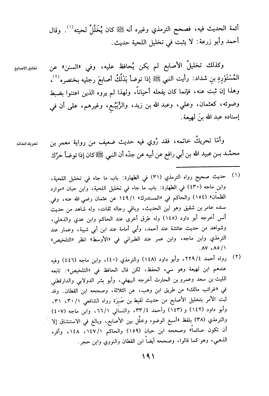 وَكَذَلِكَ تَخْلِيلُ الْأَصَابِعِ لَمْ يَكُنْ يُحَافِظُ عَلَيْهِ، وَفِي " السُّنَنِ " عَنِ المستورد بن شداد: ( «رَأَيْتُ النَّبِيَّ صَلَّى اللَّهُ عَلَيْهِ وَسَلَّمَ إِذَا تَوَضَّأَ يُدَلِّكُ أَصَابِعَ رِجْلَيْهِ بِخِنْصَرِهِ» ) ، وَهَذَا إِنْ ثَبَتَ عَنْهُ فَإِنَّمَا كَانَ يَفْعَلُهُ أَحْيَانًا، وَلِهَذَا لَمْ يَرْوِهِ الَّذِينَ اعْتَنَوْا بِضَبْطِ وُضُوئِهِ كعثمان وعلي وعبد الله بن زيد والربيع وَغَيْرِهِمْ، عَلَى أَنَّ فِي إِسْنَادِهِ عَبْدَ اللَّهِ بْنَ لَهِيعَةَ.