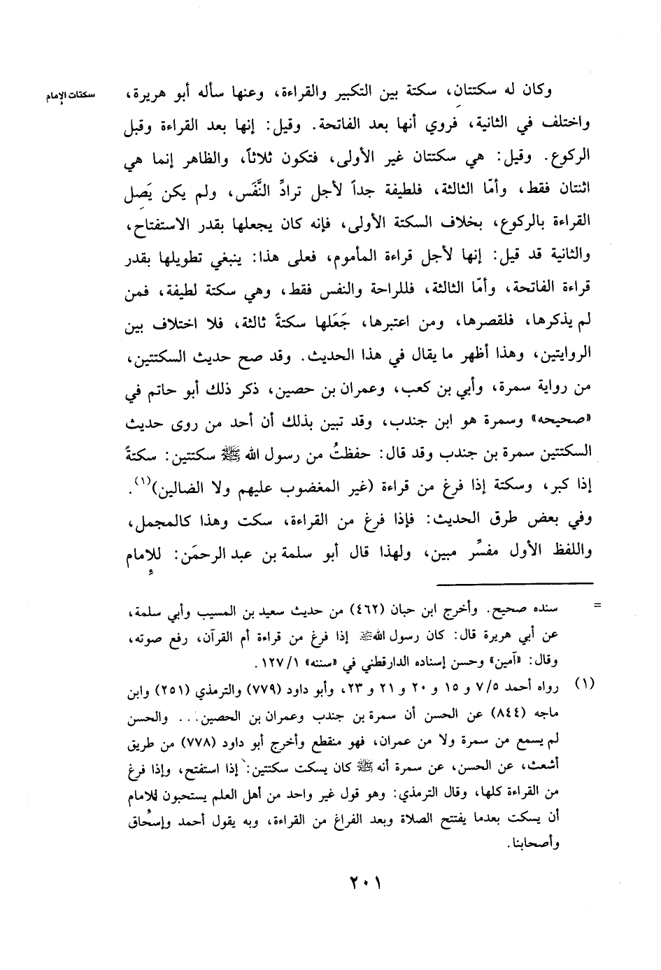 وَقَدْ صَحَّ حَدِيثُ السَّكْتَتَيْنِ مِنْ رِوَايَةِ سمرة، وَأُبَيِّ بْنِ كَعْبٍ، وَعِمْرَانَ بْنِ حُصَيْنٍ، ذَكَرَ ذَلِكَ أبو حاتم فِي " صَحِيحِهِ "، وسمرة هو ابن جندب، وَقَدْ تَبَيَّنَ بِذَلِكَ أَنَّ أَحَدَ مَنْ رَوَى حَدِيثَ السَّكْتَتَيْنِ سَمُرَةُ بْنُ جُنْدُبٍ، وَقَدْ قَالَ: ( «حَفِظْتُ مِنْ رَسُولِ اللَّهِ صَلَّى اللَّهُ عَلَيْهِ وَسَلَّمَ سَكْتَتَيْنِ سَكْتَةً إِذَا كَبَّرَ وَسَكْتَةً إِذَا فَرَغَ مِنْ قِرَاءَةِ {غَيْرِ الْمَغْضُوبِ عَلَيْهِمْ وَلَا الضَّالِّينَ} [الفاتحة: 7] » ))