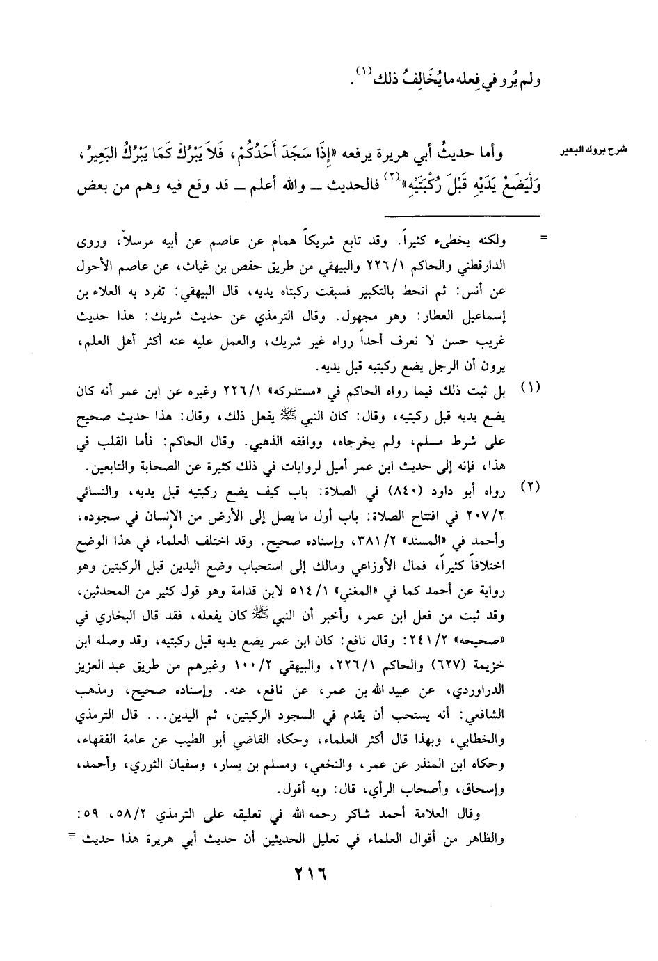 وَأَمَّا حَدِيثُ أَبِي هُرَيْرَةَ يَرْفَعُهُ ( «إِذَا سَجَدَ أَحَدُكُمْ فَلَا يَبْرُكْ كَمَا يَبْرُكُ الْبَعِيرُ، وَلْيَضَعْ يَدَيْهِ قَبْلَ رُكْبَتَيْهِ» ) فَالْحَدِيثُ - وَاللَّهُ أَعْلَمُ - قَدْ وَقَعَ فِيهِ وَهْمٌ مِنْ بَعْضِ