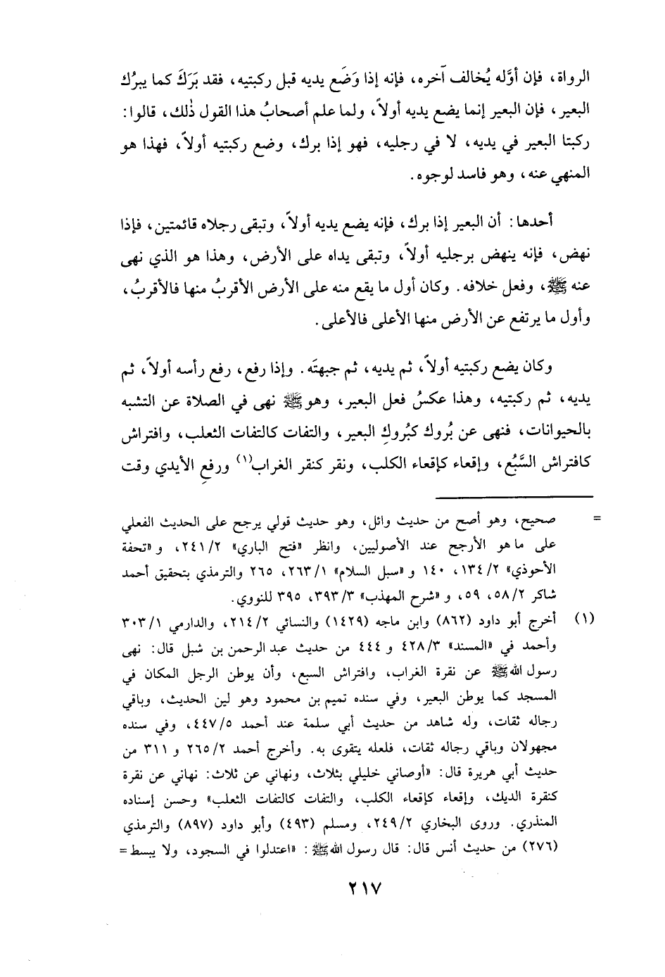 الرُّوَاةِ، فَإِنَّ أَوَّلَهُ يُخَالِفُ آخِرَهُ، فَإِنَّهُ إِذَا وَضَعَ يَدَيْهِ قَبْلَ رُكْبَتَيْهِ فَقَدْ بَرَكَ كَمَا يَبْرُكُ الْبَعِيرُ، فَإِنَّ الْبَعِيرَ إِنَّمَا يَضَعُ يَدَيْهِ أَوَّلًا، وَلَمَّا عَلِمَ أَصْحَابُ هَذَا الْقَوْلِ ذَلِكَ قَالُوا: رُكْبَتَا الْبَعِيرِ فِي يَدَيْهِ، لَا فِي رِجْلَيْهِ، فَهُوَ إِذَا بَرَكَ وَضَعَ رُكْبَتَيْهِ أَوَّلًا، فَهَذَا هُوَ الْمَنْهِيُّ عَنْهُ. وَهُوَ فَاسِدٌ لِوُجُوهٍ.