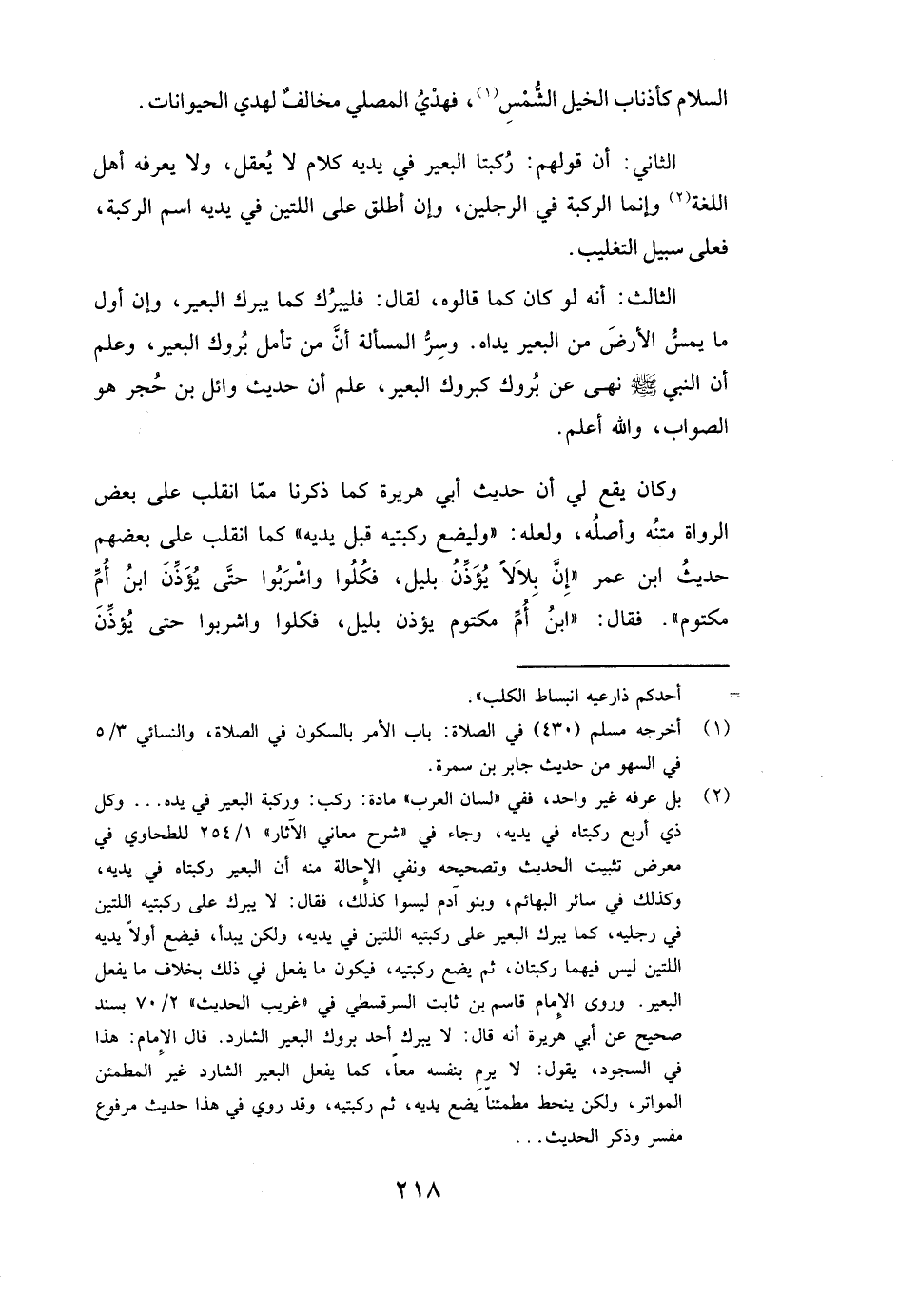 الثَّانِي: أَنَّ قَوْلَهُمْ: رُكْبَتَا الْبَعِيرِ فِي يَدَيْهِ كَلَامٌ لَا يُعْقَلُ وَلَا يَعْرِفُهُ أَهْلُ اللُّغَةِ، وَإِنَّمَا الرُّكْبَةُ فِي الرِّجْلَيْنِ، وَإِنْ أُطْلِقَ عَلَى اللَّتَيْنِ فِي يَدَيْهِ اسْمُ الرُّكْبَةِ فَعَلَى سَبِيلِ التَّغْلِيبِ.