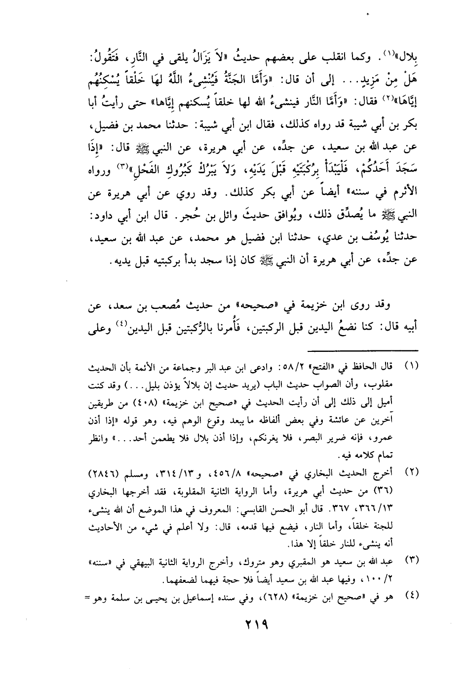 وَكَمَا انْقَلَبَ عَلَى بَعْضِهِمْ حَدِيثُ: ( «لَا يَزَالُ يُلْقَى فِي النَّارِ فَتَقُولُ: هَلْ مِنْ مَزِيدٍ، إِلَى أَنْ قَالَ: وَأَمَّا الْجَنَّةُ فَيُنْشِئُ اللَّهُ لَهَا خَلْقًا يُسْكِنُهُمْ إِيَّاهَا، فَقَالَ: وَأَمَّا النَّارُ فَيُنْشِئُ اللَّهُ لَهَا خَلْقًا يُسْكِنُهُمْ إِيَّاهَا» ، حَتَّى رَأَيْتُ أَبَا بَكْرِ بْنَ أَبِي شَيْبَةَ قَدْ رَوَاهُ كَذَلِكَ، فَقَالَ ابْنُ أَبِي شَيْبَةَ: حَدَّثَنَا مُحَمَّدُ بْنُ فُضَيْلٍ، عَنْ عبد الله بن سعيد، عَنْ جَدِّهِ، عَنْ أَبِي هُرَيْرَةَ عَنِ النَّبِيِّ صَلَّى اللَّهُ عَلَيْهِ وَسَلَّمَ: ( «إِذَا سَجَدَ أَحَدُكُمْ فَلْيَبْدَأْ بِرُكْبَتَيْهِ قَبْلَ يَدَيْهِ، وَلَا يَبْرُكْ كَبُرُوكِ الْفَحْلِ» ) وَرَوَاهُ الأثرم فِي سُنَنِهِ أَيْضًا عَنْ أَبِي بَكْرٍ كَذَلِكَ.
