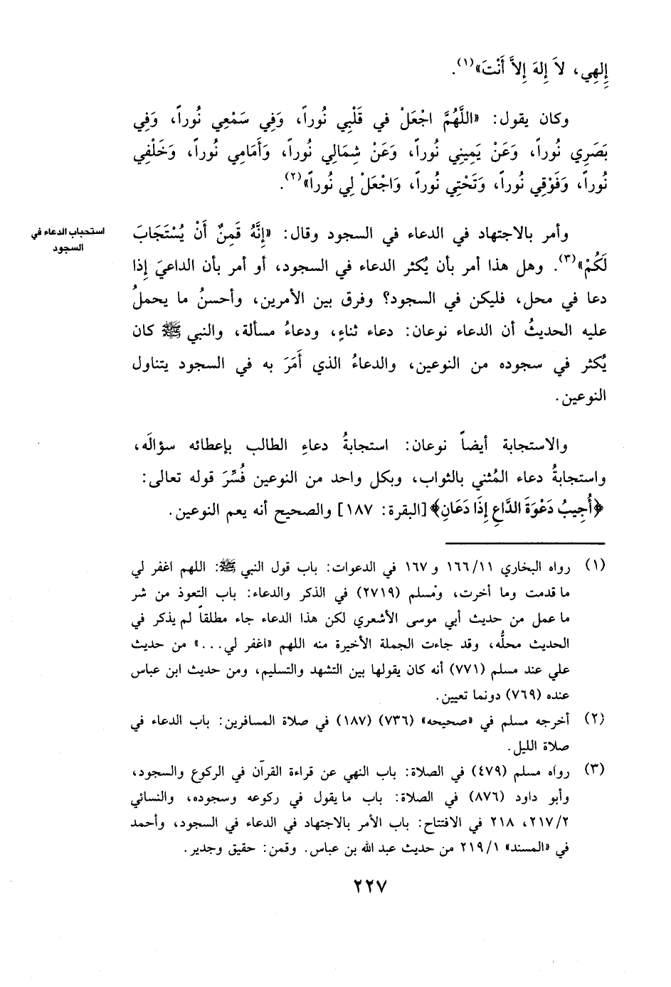وَأَمَرَ بِالِاجْتِهَادِ فِي الدُّعَاءِ فِي السُّجُودِ وَقَالَ: ( «إِنَّهُ قَمِنٌ أَنْ يُسْتَجَابَ لَكُمْ» ) . وَهَلْ هَذَا أَمْرٌ بِأَنْ يُكْثِرَ الدُّعَاءَ فِي السُّجُودِ، أَوْ أَمْرٌ بِأَنَّ الدَّاعِيَ إِذَا دَعَا فِي مَحَلٍّ، فَلْيَكُنْ فِي السُّجُودِ؟ وَفَرْقٌ بَيْنَ الْأَمْرَيْنِ، وَأَحْسَنُ مَا يُحْمَلُ عَلَيْهِ الْحَدِيثُ أَنَّ الدُّعَاءَ نَوْعَانِ: دُعَاءُ ثَنَاءٍ، وَدُعَاءُ مَسْأَلَةٍ، وَالنَّبِيُّ صَلَّى اللَّهُ عَلَيْهِ وَسَلَّمَ كَانَ يُكْثِرُ فِي سُجُودِهِ مِنَ النَّوْعَيْنِ، وَالدُّعَاءُ الَّذِي أَمَرَ بِهِ فِي السُّجُودِ يَتَنَاوَلُ النَّوْعَيْنِ.