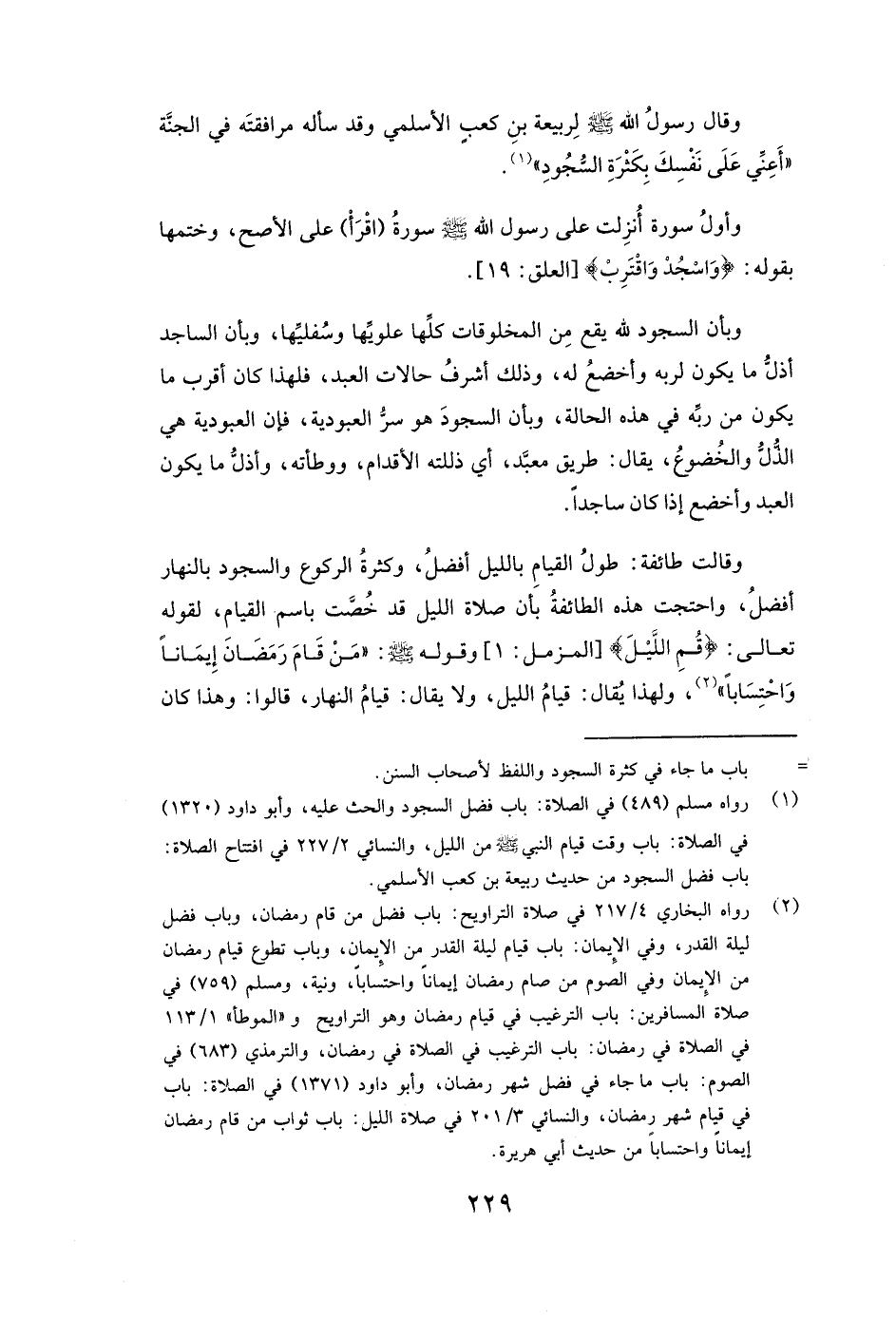 وَقَالَتْ طَائِفَةٌ: طُولُ الْقِيَامِ بِاللَّيْلِ أَفْضَلُ، وَكَثْرَةُ الرُّكُوعِ وَالسُّجُودِ بِالنَّهَارِ أَفْضَلُ، وَاحْتَجَّتْ هَذِهِ الطَّائِفَةُ بِأَنَّ صَلَاةَ اللَّيْلِ قَدْ خُصَّتْ بِاسْمِ الْقِيَامِ لِقَوْلِهِ تَعَالَى: {قُمِ اللَّيْلَ} [المزمل: 2] [الْمُزَّمِّلِ: 1] ، وَقَوْلِهِ صَلَّى اللَّهُ عَلَيْهِ وَسَلَّمَ ( «مَنْ قَامَ رَمَضَانَ إِيمَانًا وَاحْتِسَابًا» ) ، وَلِهَذَا يُقَالُ: قِيَامُ اللَّيْلِ، وَلَا يُقَالُ: قِيَامُ النَّهَارِ، قَالُوا: وَهَذَا كَانَ