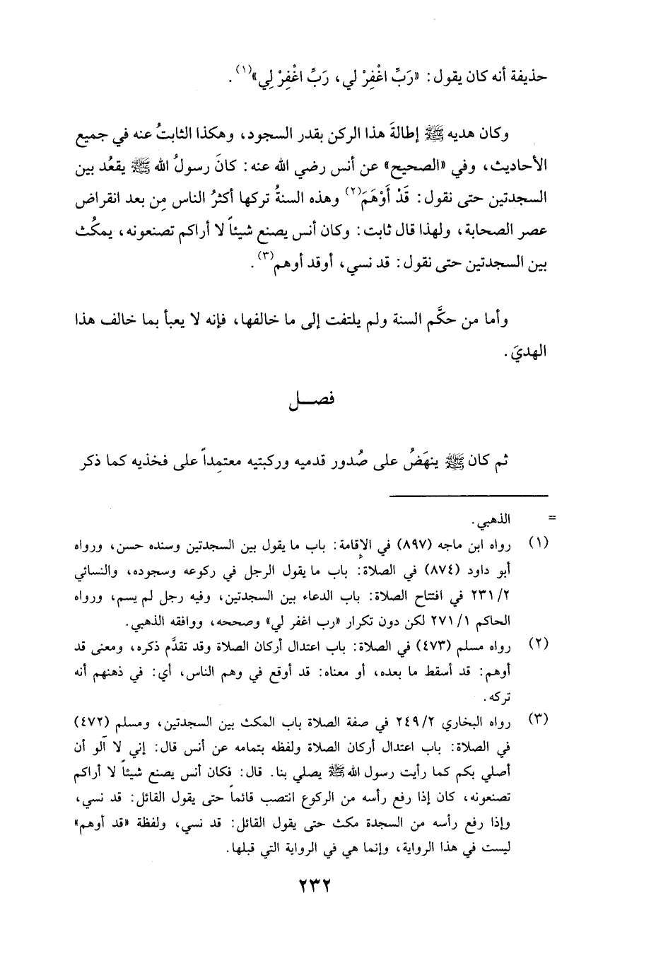 وَكَانَ هَدْيُهُ صَلَّى اللَّهُ عَلَيْهِ وَسَلَّمَ إِطَالَةَ هَذَا الرُّكْنِ بِقَدْرِ السُّجُودِ، وَهَكَذَا الثَّابِتُ عَنْهُ فِي جَمِيعِ الْأَحَادِيثِ، وَفِي " الصَّحِيحِ " عَنْ أنس رَضِيَ اللَّهُ عَنْهُ: ( «كَانَ رَسُولُ اللَّهِ صَلَّى اللَّهُ عَلَيْهِ وَسَلَّمَ يَقْعُدُ بَيْنَ السَّجْدَتَيْنِ حَتَّى نَقُولَ: قَدْ أَوْهَمَ» ) وَهَذِهِ السُّنَّةُ تَرَكَهَا أَكْثَرُ النَّاسِ مِنْ بَعْدِ انْقِرَاضِ عَصْرِ الصَّحَابَةِ، وَلِهَذَا قَالَ ثابت: وَكَانَ أنس يَصْنَعُ شَيْئًا لَا أَرَاكُمْ تَصْنَعُونَهُ، يَمْكُثُ بَيْنَ السَّجْدَتَيْنِ حَتَّى نَقُولَ: قَدْ نَسِيَ أَوْ قَدْ أَوْهَمَ.