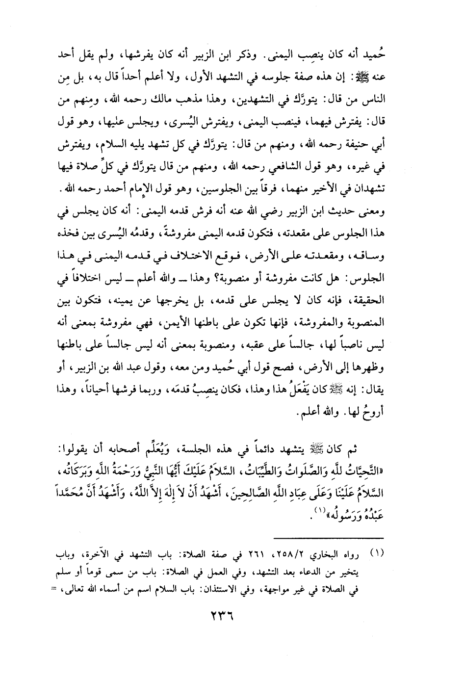 حميد أَنَّهُ كَانَ يَنْصِبُ الْيُمْنَى. وَذَكَرَ ابن الزبير أَنَّهُ كَانَ يَفْرِشُهَا، وَلَمْ يَقُلْ أَحَدٌ عَنْهُ صَلَّى اللَّهُ عَلَيْهِ وَسَلَّمَ: إِنَّ هَذِهِ صِفَةُ جُلُوسِهِ فِي التَّشَهُّدِ الْأَوَّلِ، وَلَا أَعْلَمُ أَحَدًا قَالَ بِهِ، بَلْ مِنَ النَّاسِ مَنْ قَالَ: يَتَوَرَّكُ فِي التَّشَهُّدَيْنِ، وَهَذَا مَذْهَبُ مالك رَحِمَهُ اللَّهُ.
