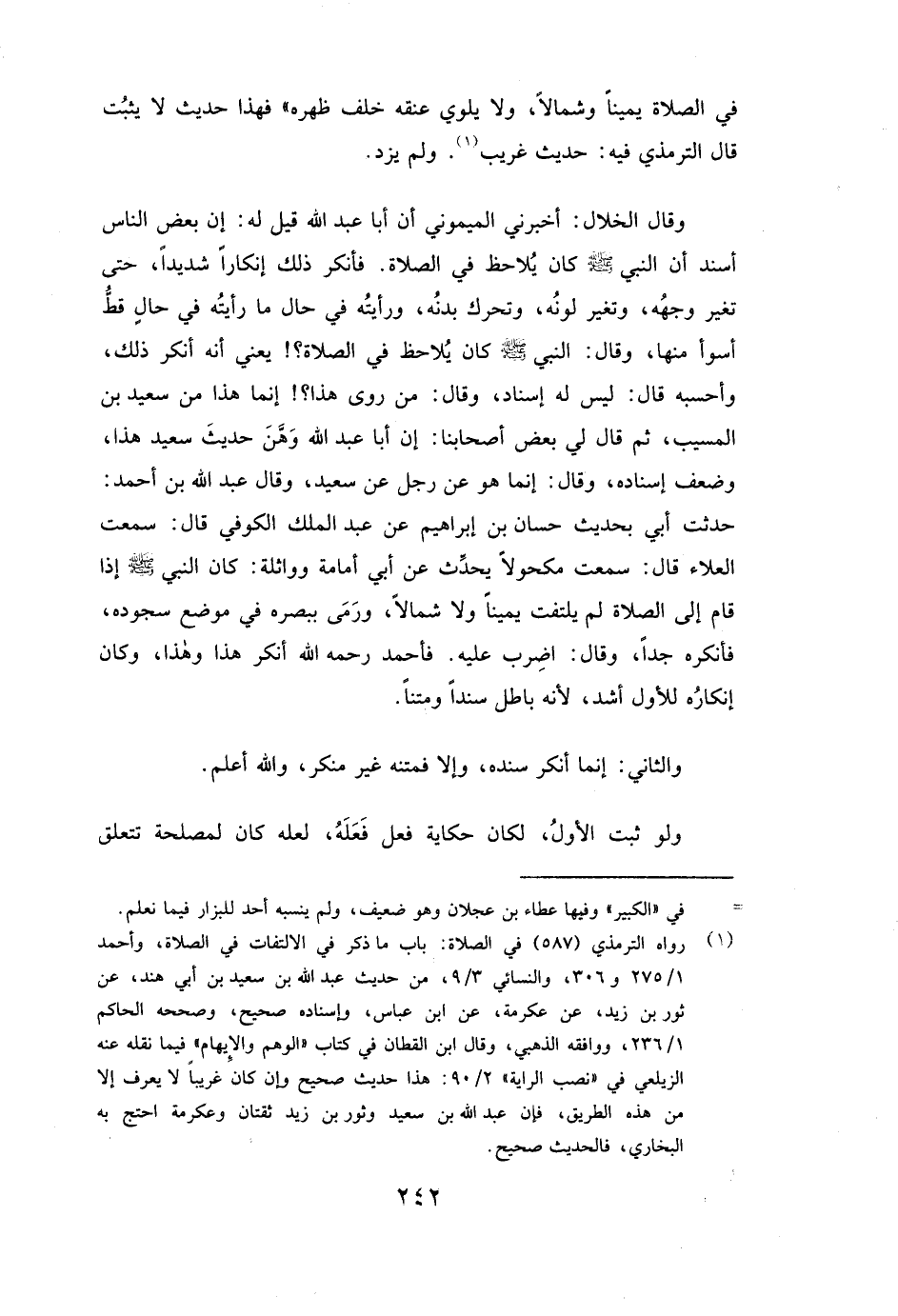 وَقَالَ الخلال: أَخْبَرَنِي الميموني أَنَّ أبا عبد الله قِيلَ لَهُ: إِنَّ بَعْضَ النَّاسِ أَسْنَدَ أَنَّ النَّبِيَّ صَلَّى اللَّهُ عَلَيْهِ وَسَلَّمَ كَانَ يُلَاحِظُ فِي الصَّلَاةِ. فَأَنْكَرَ ذَلِكَ إِنْكَارًا شَدِيدًا حَتَّى تَغَيَّرَ وَجْهُهُ، وَتَغَيَّرَ لَوْنُهُ وَتَحَرَّكَ بَدَنُهُ، وَرَأَيْتُهُ فِي حَالٍ مَا رَأَيْتُهُ فِي حَالٍ قَطُّ أَسْوَأَ مِنْهَا، وَقَالَ: النَّبِيُّ صَلَّى اللَّهُ عَلَيْهِ وَسَلَّمَ كَانَ يُلَاحِظُ فِي الصَّلَاةِ؟ ! يَعْنِي أَنَّهُ أَنْكَرَ ذَلِكَ، وَأَحْسَبُهُ قَالَ: لَيْسَ لَهُ إِسْنَادٌ، وَقَالَ: مَنْ رَوَى هَذَا؟ إِنَّمَا هَذَا مِنْ سَعِيدِ بْنِ الْمُسَيَّبِ، ثُمَّ قَالَ لِي بَعْضُ أَصْحَابِنَا: إِنَّ أبا عبد الله وَهَّنَ حَدِيثَ سعيد هَذَا وَضَعَّفَ إِسْنَادَهُ، وَقَالَ: إِنَّمَا هُوَ عَنْ رَجُلٍ عَنْ سعيد، وَقَالَ عبد الله بن أحمد: حَدَّثْتُ أَبِي بِحَدِيثِ حَسَّانَ بْنِ إِبْرَاهِيمَ عَنْ عبد الملك الكوفي قَالَ: سَمِعْتُ العلاء قَالَ: سَمِعْتُ مكحولا يُحَدِّثُ عَنْ أبي أمامة وواثلة: ( «كَانَ النَّبِيُّ صَلَّى اللَّهُ عَلَيْهِ وَسَلَّمَ إِذَا قَامَ إِلَى الصَّلَاةِ لَمْ يَلْتَفِتْ يَمِينًا وَلَا شِمَالًا، وَرَمَى بِبَصَرِهِ فِي مَوْضِعِ سُجُودِهِ» ) فَأَنْكَرَهُ جِدًّا وَقَالَ: اضْرِبْ عَلَيْهِ. فأحمد رَحِمَهُ اللَّهُ أَنْكَرَ هَذَا وَهَذَا، وَكَانَ إِنْكَارُهُ لِلْأَوَّلِ أَشَدَّ؛ لِأَنَّهُ بَاطِلٌ سَنَدًا وَمَتْنًا.