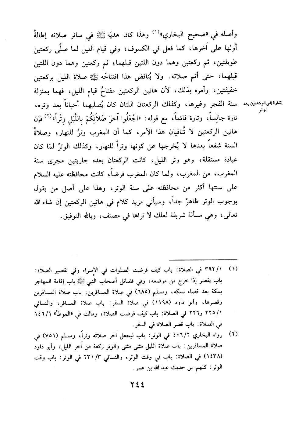 وَلَا يُنَاقِضُ هَذَا افْتِتَاحَهُ صَلَّى اللَّهُ عَلَيْهِ وَسَلَّمَ صَلَاةَ اللَّيْلِ بِرَكْعَتَيْنِ خَفِيفَتَيْنِ وَأَمْرَهُ بِذَلِكَ، لِأَنَّ هَاتَيْنِ الرَّكْعَتَيْنِ مِفْتَاحُ قِيَامِ اللَّيْلِ، فَهُمَا بِمَنْزِلَةِ سُنَّةِ الْفَجْرِ وَغَيْرِهَا، وَكَذَلِكَ الرَّكْعَتَانِ اللَّتَانِ كَانَ يُصَلِّيهِمَا أَحْيَانًا بَعْدَ وِتْرِهِ تَارَةً جَالِسًا وَتَارَةً قَائِمًا مَعَ قَوْلِهِ: ( «اجْعَلُوا آخِرَ صَلَاتِكُمْ بِاللَّيْلِ وِتْرًا» ) فَإِنَّ هَاتَيْنِ الرَّكْعَتَيْنِ لَا تُنَافِيَانِ هَذَا الْأَمْرَ، كَمَا أَنَّ الْمَغْرِبَ وِتْرٌ لِلنَّهَارِ، وَصَلَاةُ السُّنَّةِ شَفْعًا بَعْدَهَا لَا يُخْرِجُهَا عَنْ كَوْنِهَا وِتْرًا لِلنَّهَارِ، وَكَذَلِكَ الْوِتْرُ لَمَّا كَانَ عِبَادَةً مُسْتَقِلَّةً وَهُوَ وِتْرُ اللَّيْلِ كَانَتِ الرَّكْعَتَانِ بَعْدَهُ جَارِيَتَيْنِ مَجْرَى سُنَّةِ الْمَغْرِبِ مِنَ الْمَغْرِبِ، وَلَمَّا كَانَ الْمَغْرِبُ فَرْضًا كَانَتْ مُحَافَظَتُهُ عَلَيْهِ السَّلَامُ عَلَى سُنَّتِهَا أَكْثَرَ مِنْ مُحَافَظَتِهِ عَلَى سُنَّةِ الْوِتْرِ، وَهَذَا عَلَى أَصْلِ مَنْ يَقُولُ بِوُجُوبِ الْوِتْرِ ظَاهِرٌ جِدًّا، وَسَيَأْتِي مَزِيدُ كَلَامٍ فِي هَاتَيْنِ الرَّكْعَتَيْنِ إِنْ شَاءَ اللَّهُ تَعَالَى، وَهِيَ مَسْأَلَةٌ شَرِيفَةٌ لَعَلَّكَ لَا تَرَاهَا فِي مُصَنَّفٍ وَبِاللَّهِ التَّوْفِيقُ.
